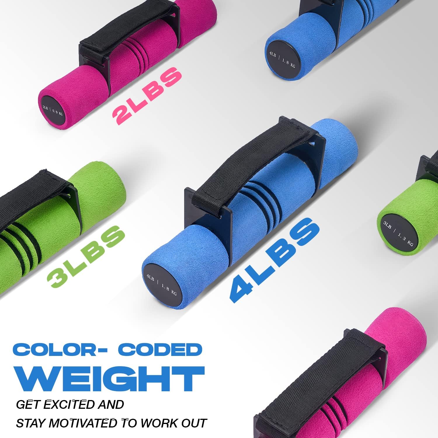 COLOR CODED BY WEIGHT: Hand weights for exercises come in three different weights 2 pounds, 3 pounds, and 4 pounds, which are easily recognized by colors to create an workout vibe for women