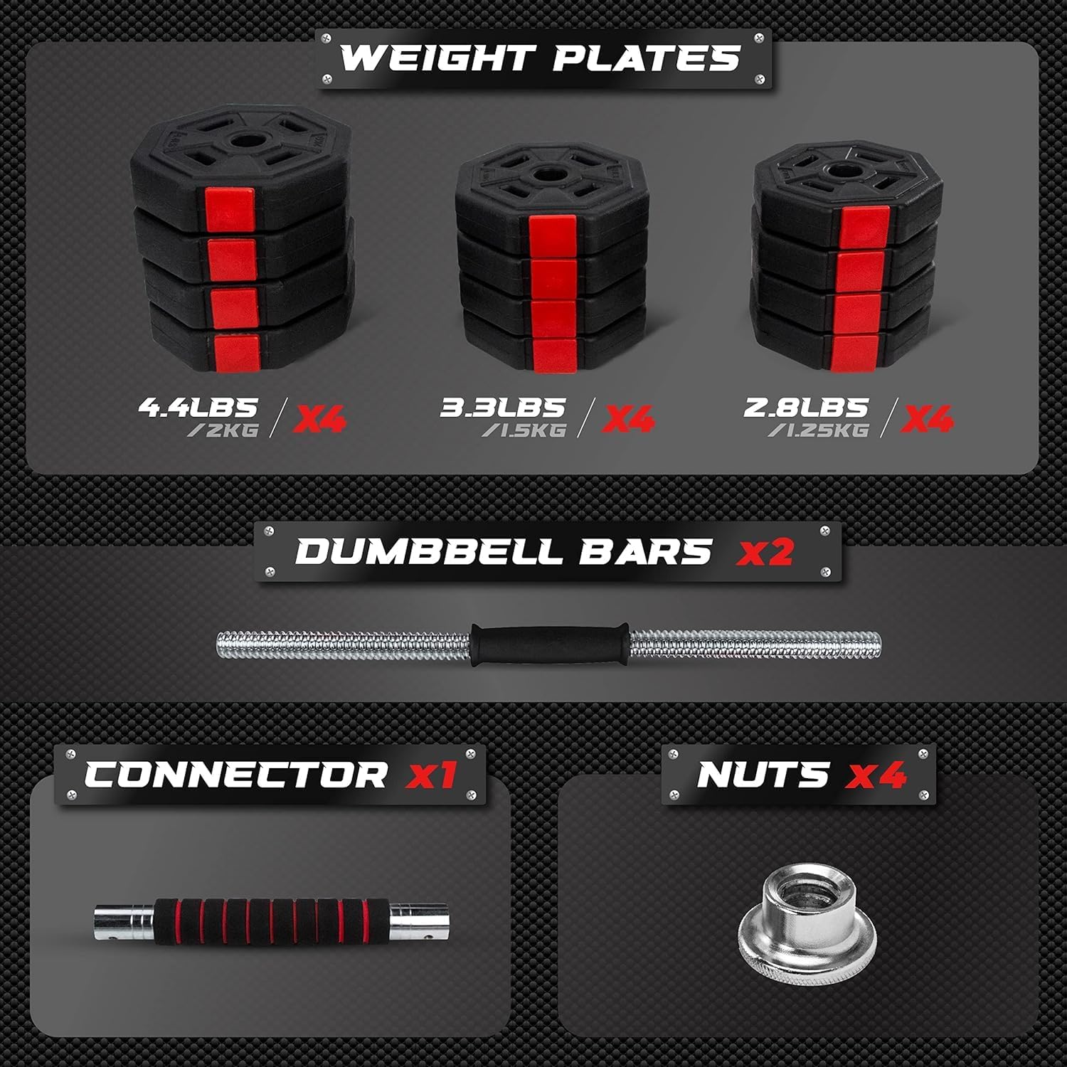 OPTIMAL COMBO – 44 LB WEIGHTS DUMBBELLS SET: This adjustable dumbbell set includes 4 hexagon plates (2.8lbs), 4 hexagon plates (3.3lbs), 4 hexagon plates (4.4lbs), 2 chrome handle, 4 chrome collars, 1 metal connector with foam