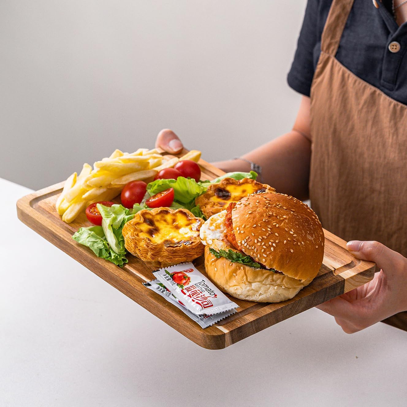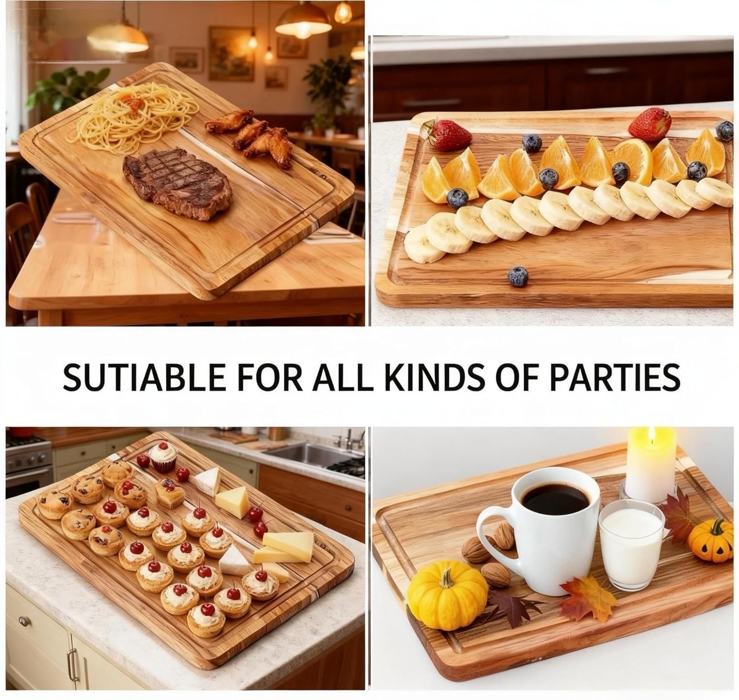 Beyond its sturdiness, this tray excels in versatility: it functions as both a dual-sided wooden board and a versatile serving tray. One side works perfectly as a cutting board for meats, fruits, and vegetables, while the other transforms into a stylish serving surface, capable of holding an array of foodsโ€”from sandwiches, salads, and cheese platters to snacks, burgers, bread, appetizers, desserts, cookies, and cupcakes. This adaptability makes it suitable for every occasion, whether youโ€™re enjoying a cozy breakfast in bed, hosting lively parties, preparing a casual family dinner, or enhancing service in restaurants and cafes. Adding to its appeal is its natural aesthetic: the trayโ€™s warm, natural wood tone complements most food colors, while its sleek, modern look catches the eye effortlessly. It infuses any setting with a touch of casual sophistication, elevating the presentation of your dishes while delivering reliable performance that meets all your food prep and serving demands.