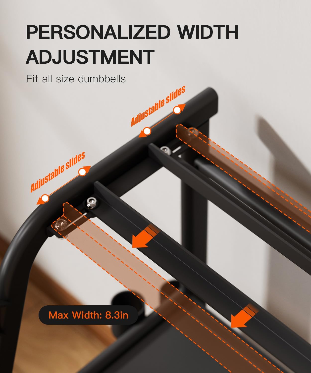 【700LB Heavy-Duty Capacity】Thickened 1.5mm steel tubes & durable frame safely hold dumbbells, barbells, and kettlebells up to 700lbs. Keep all of your weights secure at all times with the EOAT Dumbbell Rack.