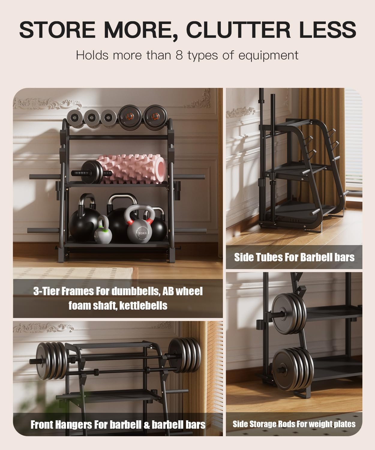 【Multi-Tier Free Weight Storage】Organize dumbbells, kettlebells, and gear effortlessly! This space-saving weight rack features three tiers for versatile storage. The adjustable top level fits various sizes and weights, while keeping your home gym tidy and essentials within reach.