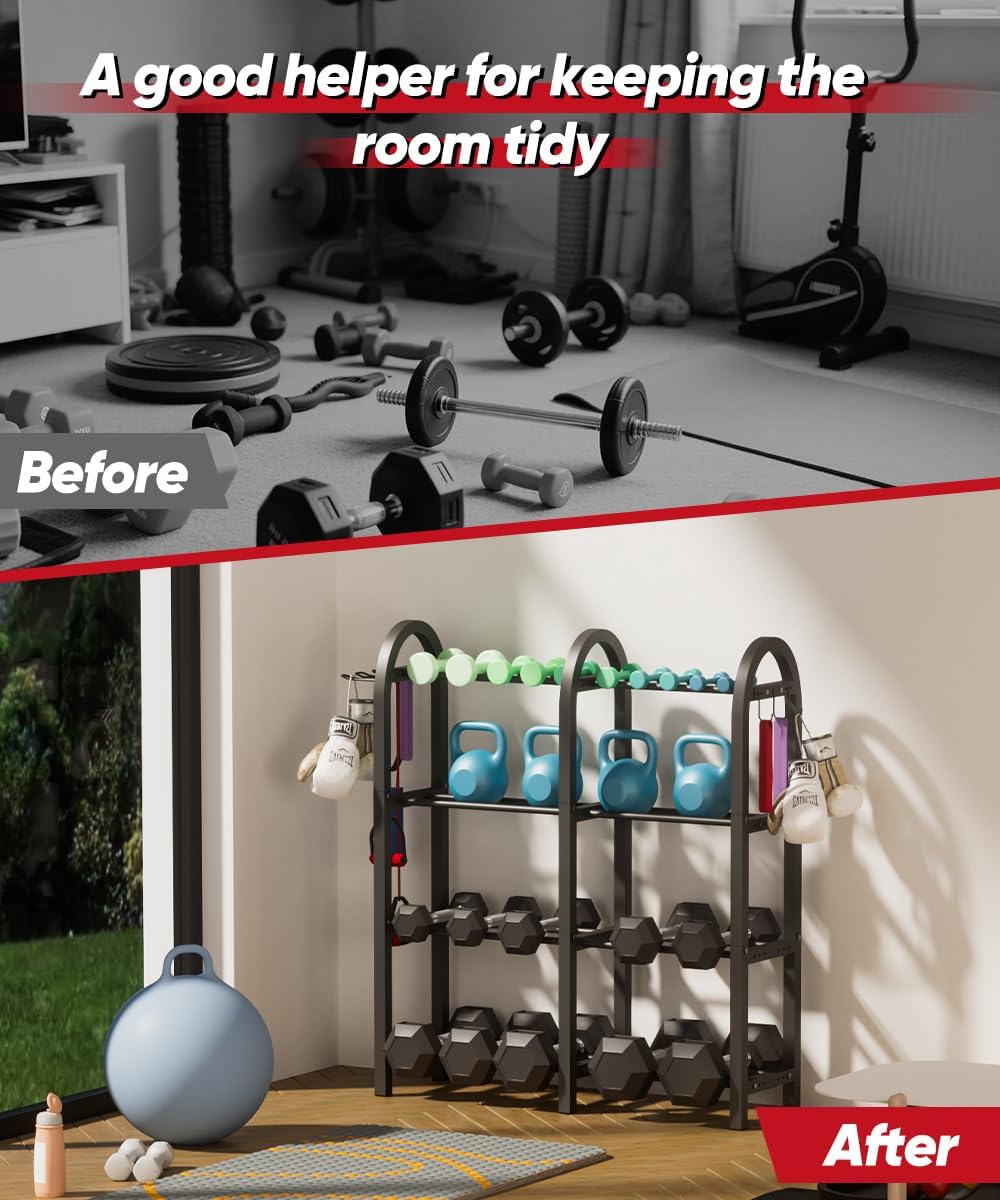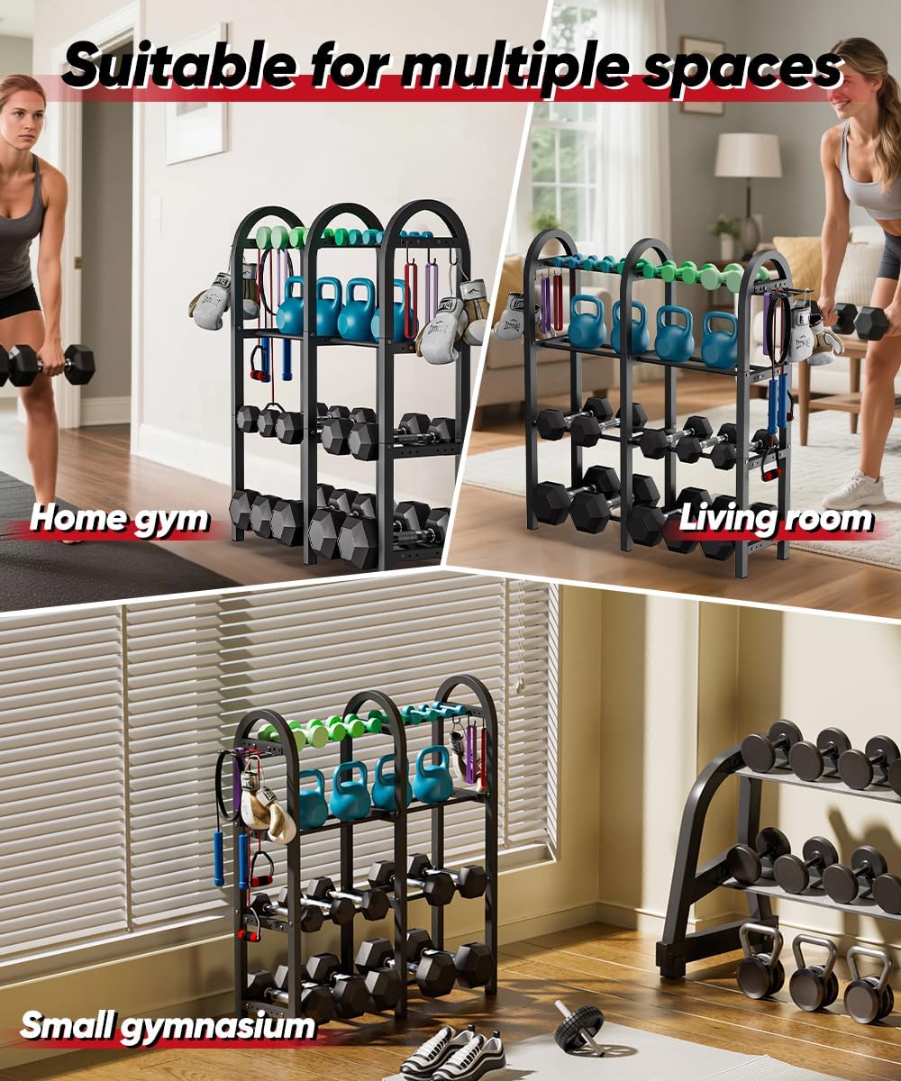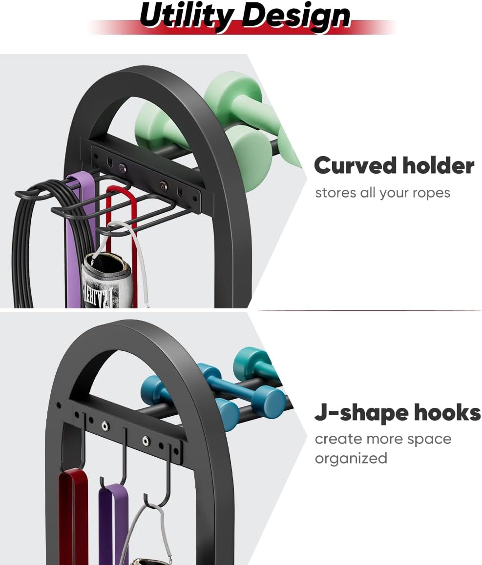 Efficient Use of Space: Keeping your workout space organized, this home gym organizer is designed for fitness enthusiasts, making it perfect for completing your workout routines in compact spaces. This small weight rack efficiently holds all your things in home gyms, yoga studios, or garages. Not only does this weight holders for free weights store dumbbells, kettlebells, but also great for organizing resistance bands, jump ropes, and other linear-shaped fitness accessories.