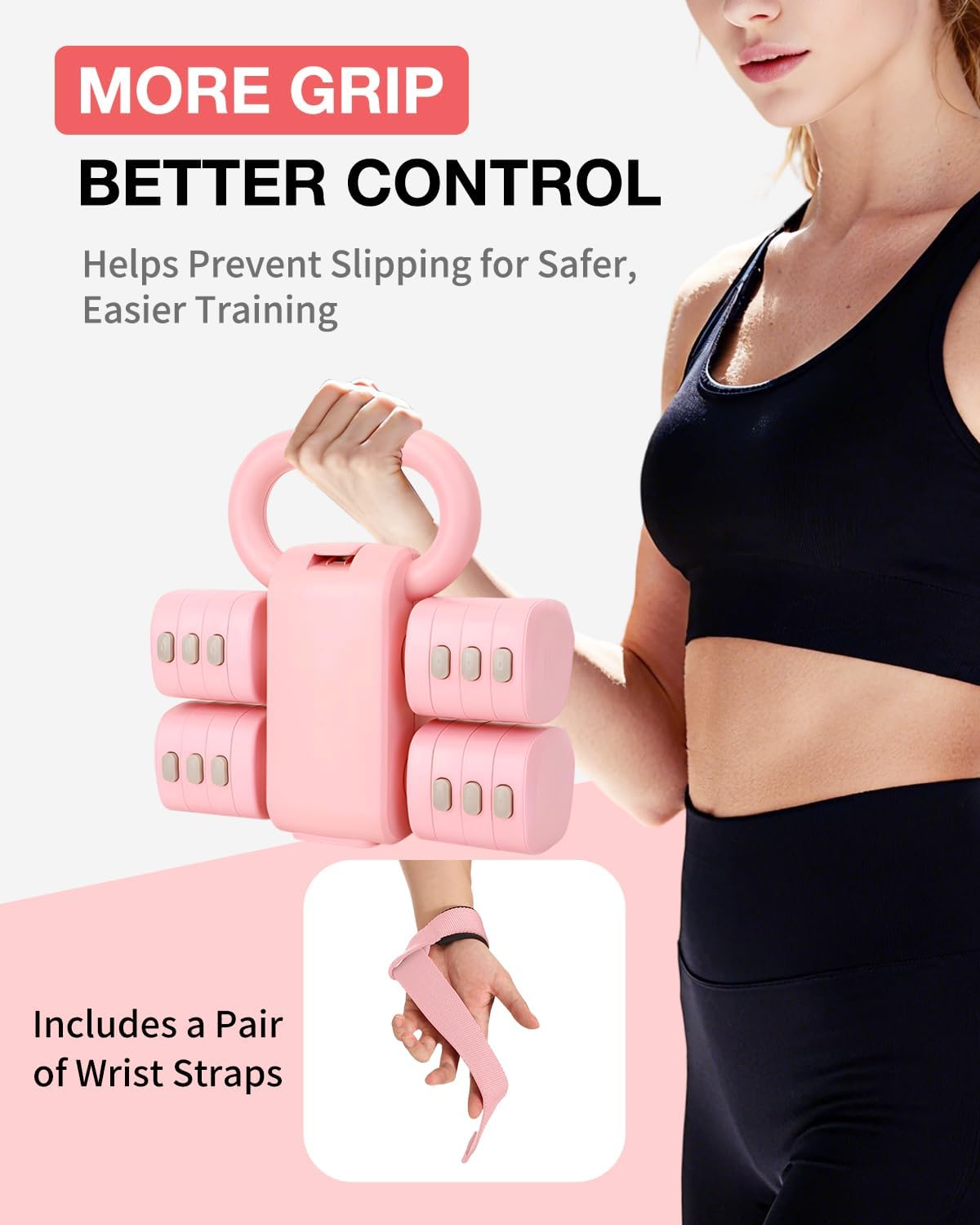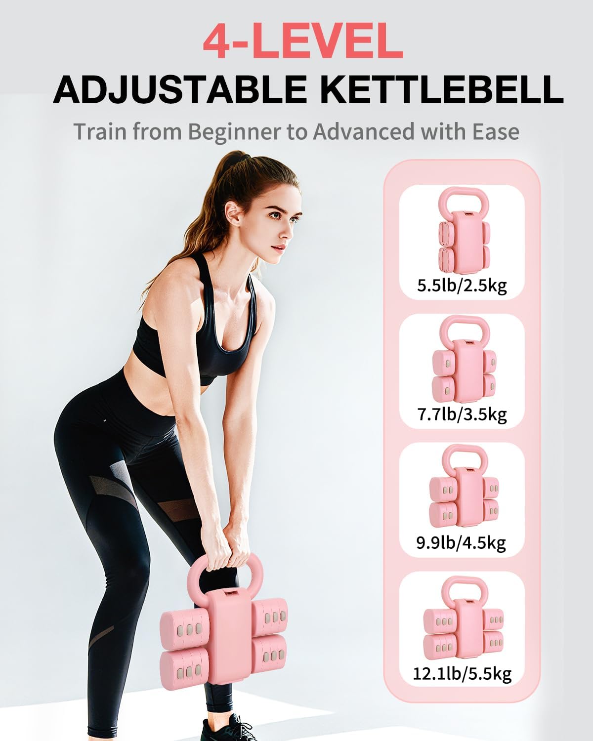 4-in-1 Adjustable Weights for All Levels: GOLDNITE adjustable kettlebell offers flexible weight options to match your fitness journey. Each dumbbell adjusts to 2.2lb, 3.3lb, 4.4lb, or 5.5lb. Combined with the 1.1lb kettlebell base, the total weight can be set from 5.5lb to 12.1lb, ideal for beginners and enthusiasts alike