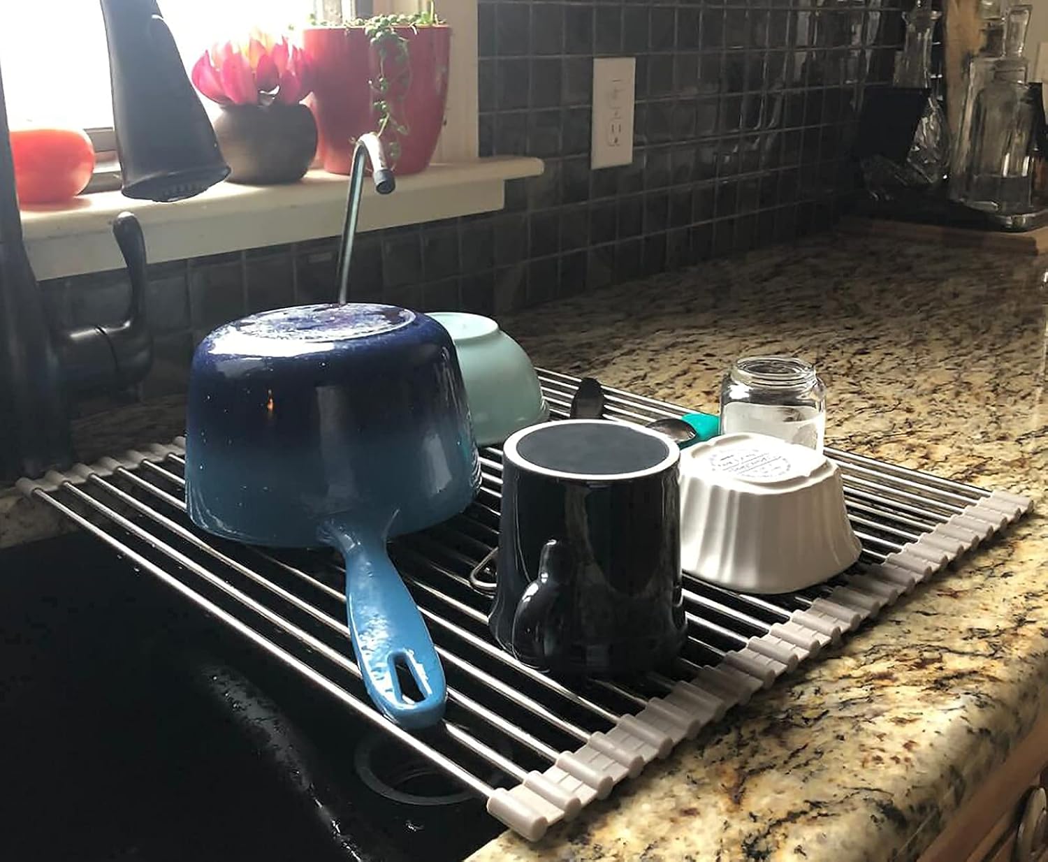 Multi-use Folding Dish Drying Rack: This roll up drying rack unrolls above an open sink for air-drying washed dishes, for additional counter top space, or as a trivet. Vegetable and fruit dish drainers, great kitchen dish racks for counter