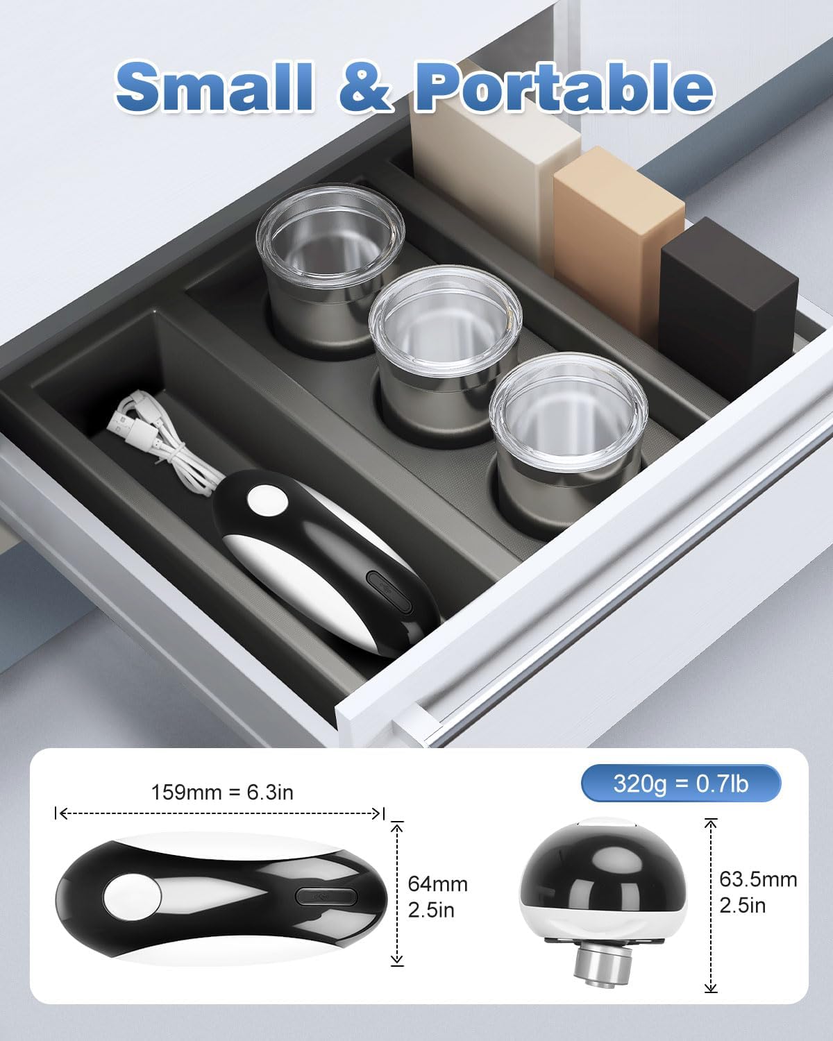 【Compatibility,Portable】Electric can openers for seniors suitable for all size types of cans. The streamlined body design is as small as a mouse and can be easily stored in a drawer or travel bag. Cordless design to get rid of bondage,camping picnic or convenience store is ready to use,kitchen and outdoor all-around assistant