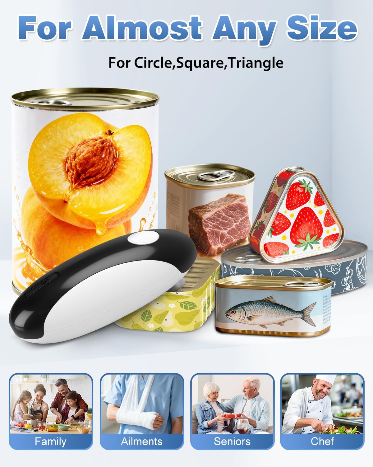 【Compatibility,Portable】Electric can openers for seniors suitable for all size types of cans. The streamlined body design is as small as a mouse and can be easily stored in a drawer or travel bag. Cordless design to get rid of bondage,camping picnic or convenience store is ready to use,kitchen and outdoor all-around assistant