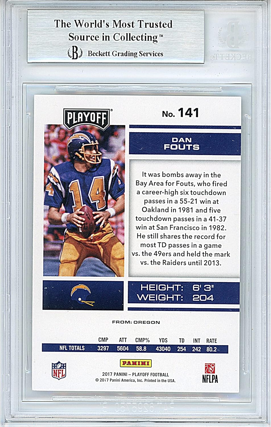 Elevate your football card collection with this autographed Dan Fouts football card. Featuring the 2017 Playoff trading card #141, this card showcases Dan Fouts during his time with the San Diego Chargers. The blue sharpie signature adds a personal touch and enhances its value as a cherished collectible. The authenticity of the autograph has been verified by Beckett Authentication Services (BAS), ensuring its genuineness. The card has been professionally slabbed by BAS for preservation and authentication, solidifying its long-term quality. The slab measures 3.25″ x 5″ and serves as both protection and a Certificate of Authenticity (COA), offering you peace of mind and a valuable addition to your collection. Measuring 2.5″ x 3.5″, this football card is a desirable item for San Diego Chargers enthusiasts and football memorabilia collectors alike. The presence of the Beckett authentication number 00013247788 further confirms the authenticity of Dan Fouts’ autograph on the card. Own a remarkable piece of football history with this autographed Dan Fouts football card. It pays tribute to the exceptional career and contributions of one of the San Diego Chargers’ most iconic quarterbacks. Whether you’re an avid collector or a devoted fan, this collectible adds value to any sports memorabilia collection.