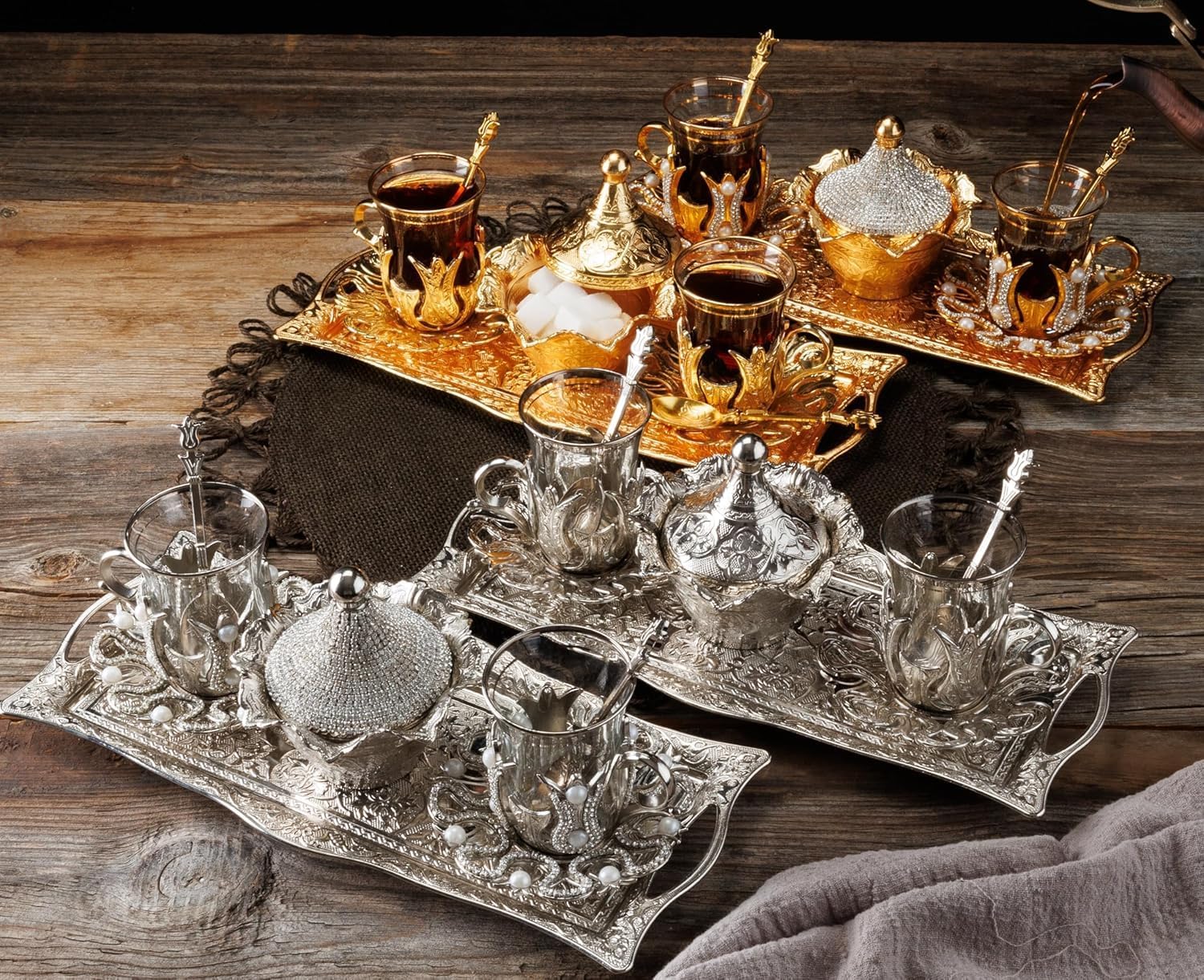 Authentic Turkish Design: Beautifully crafted set includes 2 glasses with metal holders, saucers, spoons, and a 12×5 inch tray.