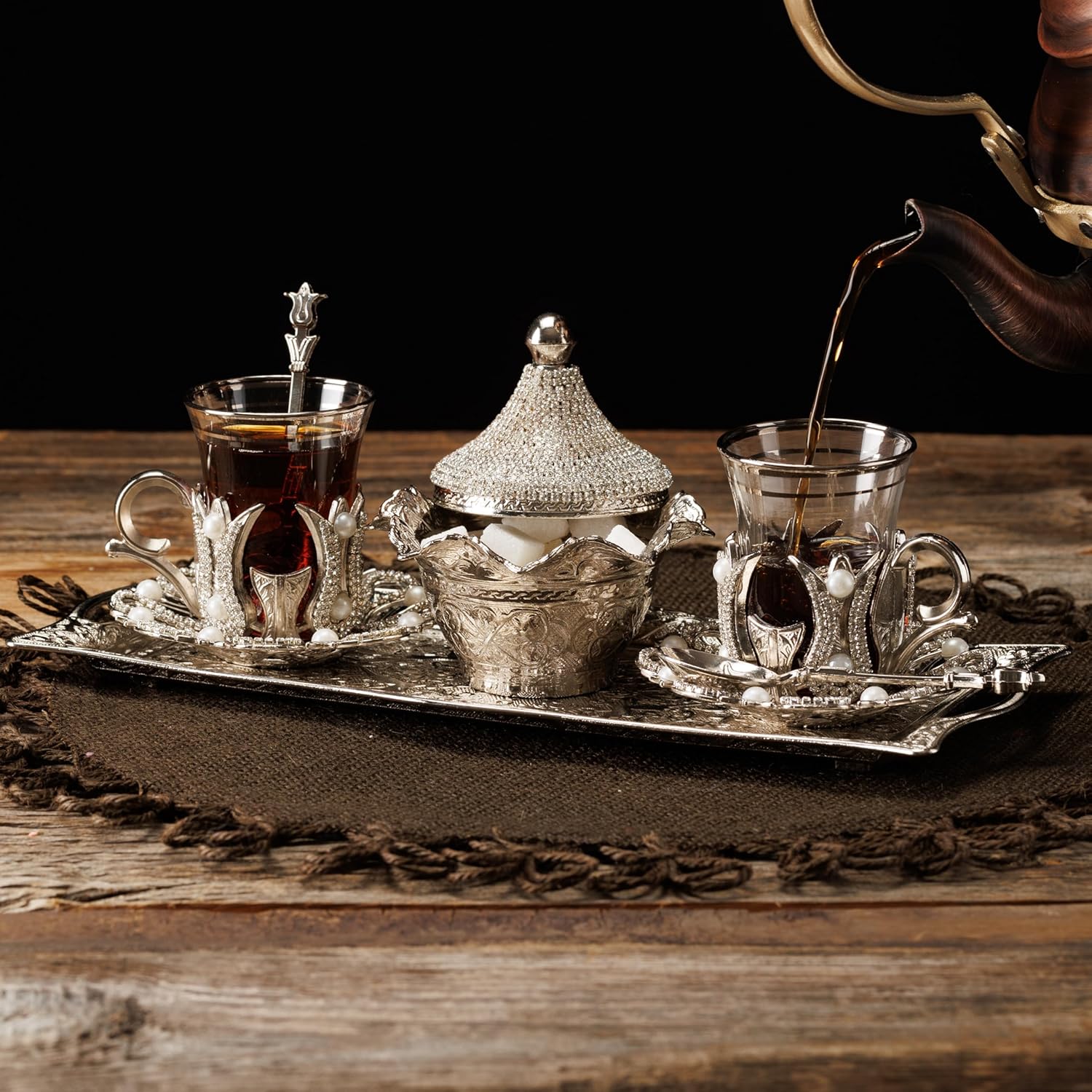 DEMMEX Turkish Tea and Coffee Serving Set for 2 – Includes 2 Glasses, Metal Glass Holders, Saucers, Spoons, Sugar Bowl with Lid, and Tray – Engraved, 3.3 fl oz Capacity, 12″ x 5″ (Crystals, Silver)