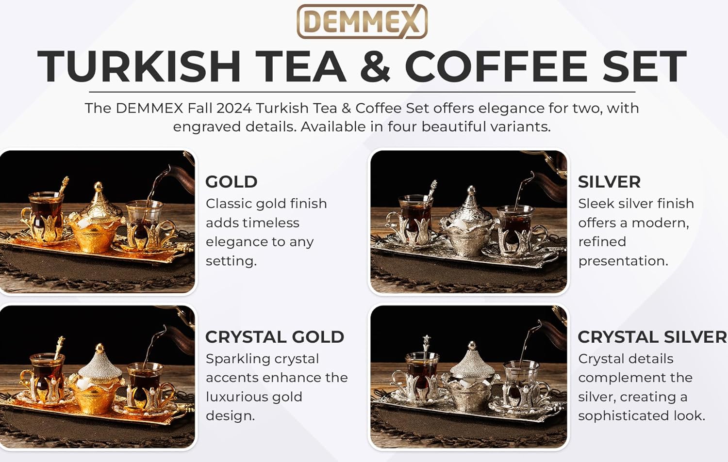 DEMMEX Turkish Tea and Coffee Serving Set for 2 – Includes 2 Glasses, Metal Glass Holders, Saucers, Spoons, Sugar Bowl with Lid, and Tray – Engraved, 3.3 fl oz Capacity, 12″ x 5″ (Crystals, Silver)