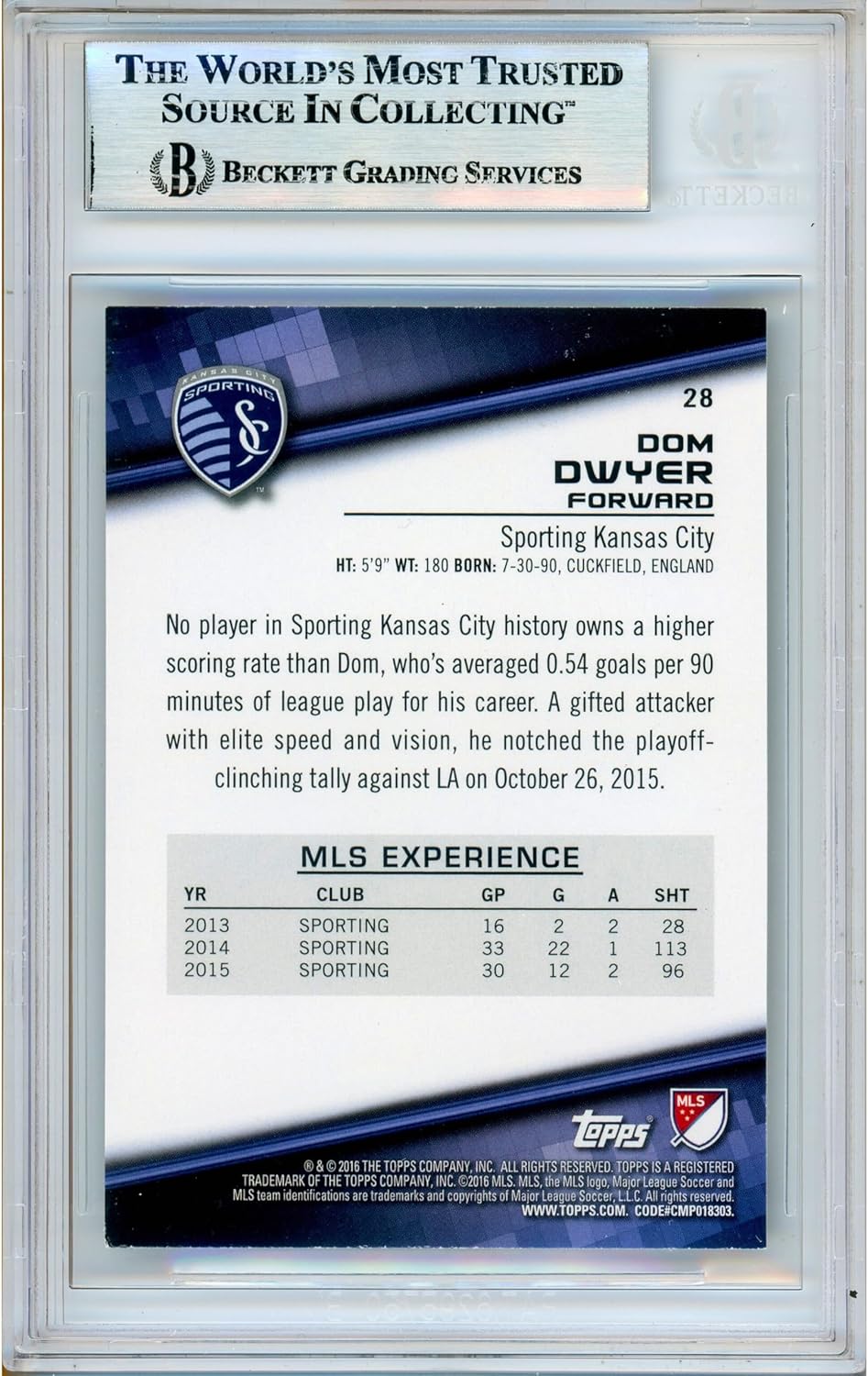A treasure for soccer fans! Presenting the Dom Dwyer autographed 2016 Topps MLS soccer card #28. As a key figure for Sporting Kansas City, Dom Dwyer’s flair and playmaking abilities have made him a standout player in Major League Soccer (MLS). This card beautifully portrays Dom Dwyer, accentuated by his black sharpie signature. It’s a testament to his impact on the field and his devotion to the game. Moreover, this card’s authenticity is beyond question as it’s verified by Beckett Authentication Services (BAS), coming with the authentication number 00017811309. Additionally, the card is encapsulated in a resilient 3.25″ x 5″ slab that protects the integrity of the signature and the card itself. Whether you’re a Sporting KC supporter, an MLS fan, or a devoted card collector, this Dom Dwyer signed card is a timeless piece that represents dedication and excellence in soccer. Don’t let this gem slip away! Click ‘Add to Cart’ to capture a slice of Sporting Kansas City’s history with Dom Dywer’s autographed card.