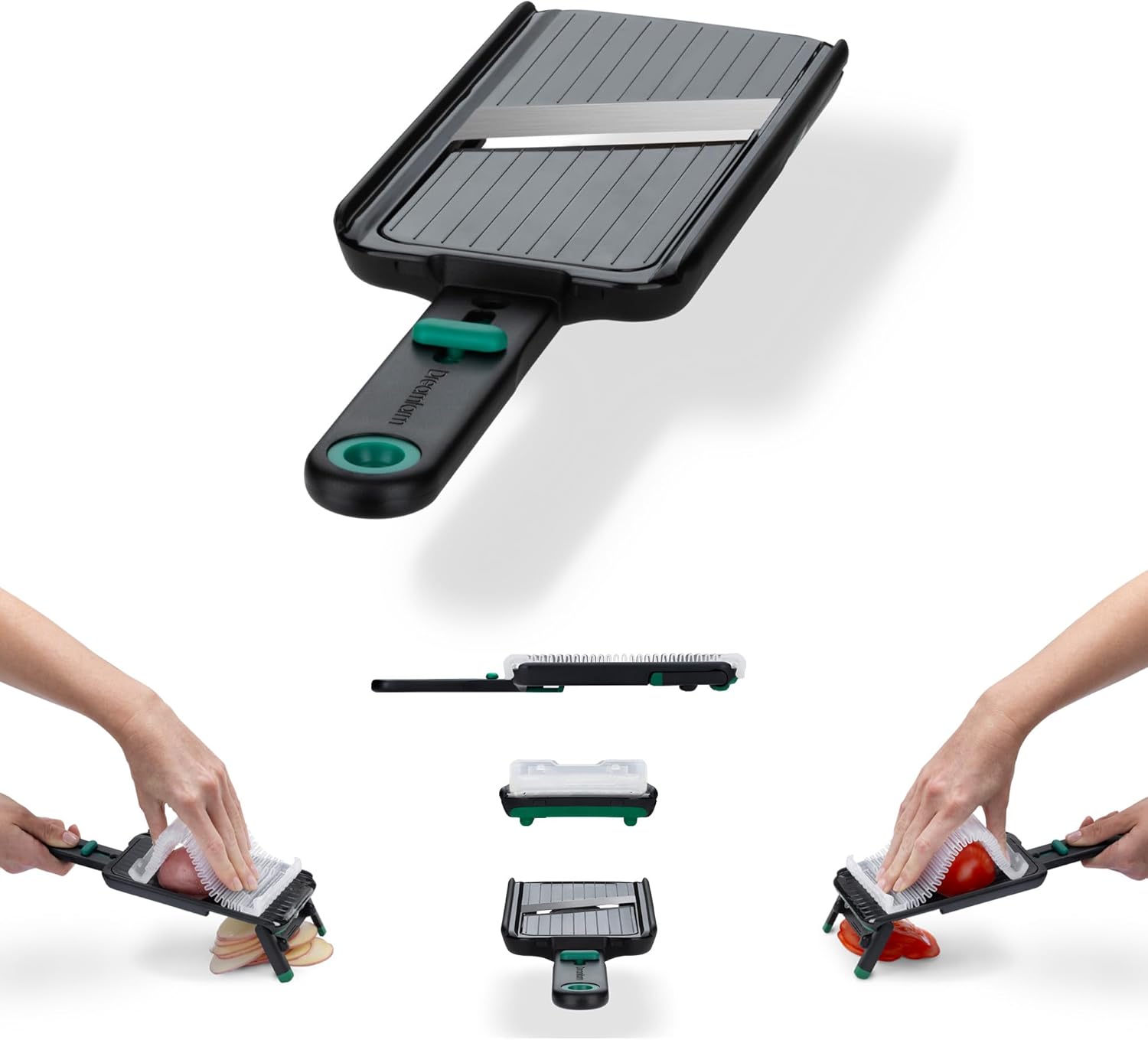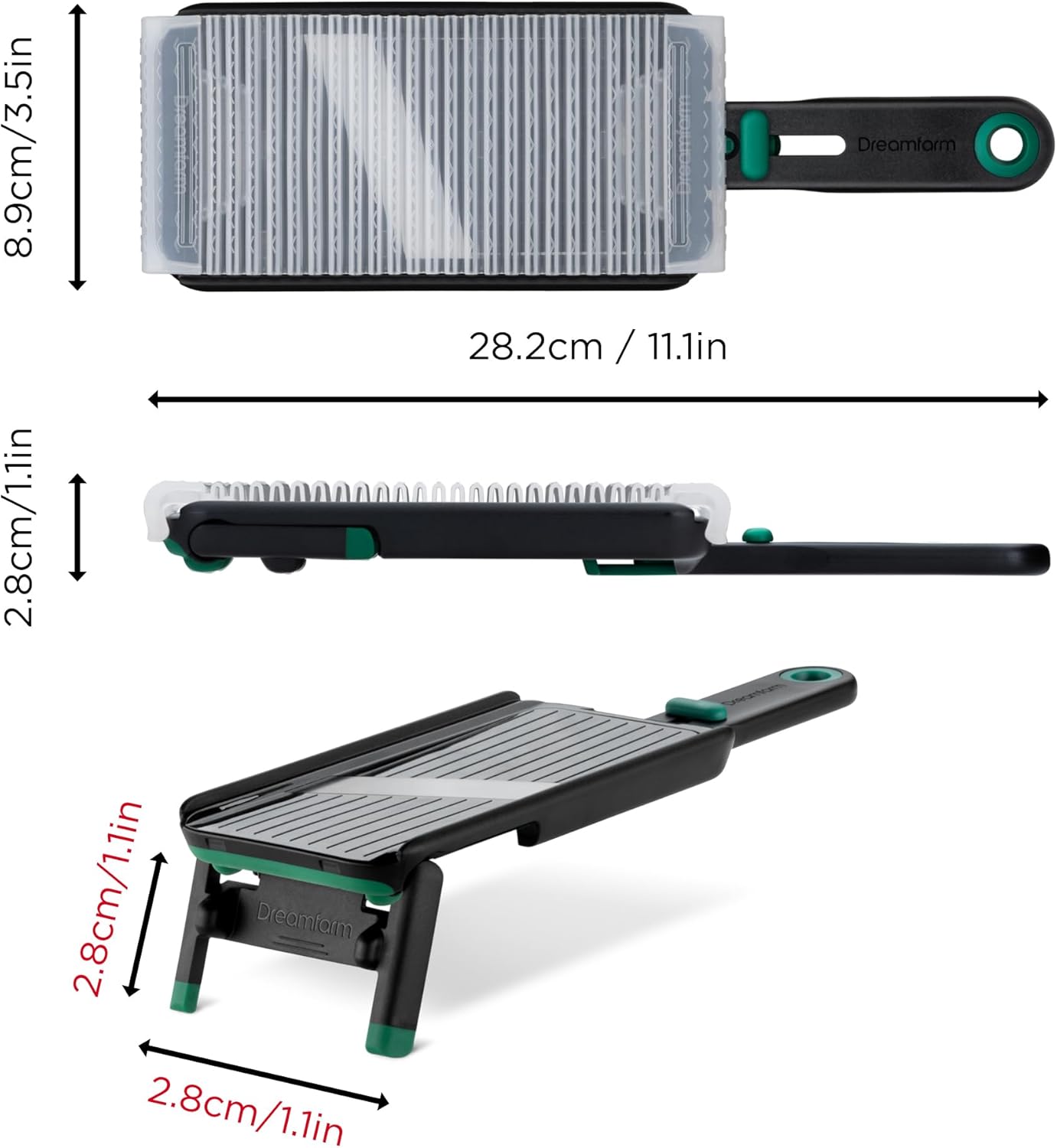 Dreamfarm Nocutu Handheld Safety Mandoline Slicer, Food Vegetable Cutter with Non-Slip Bowl Hook & Foot – Adjustable 1-3mm Slicer, Black/Green