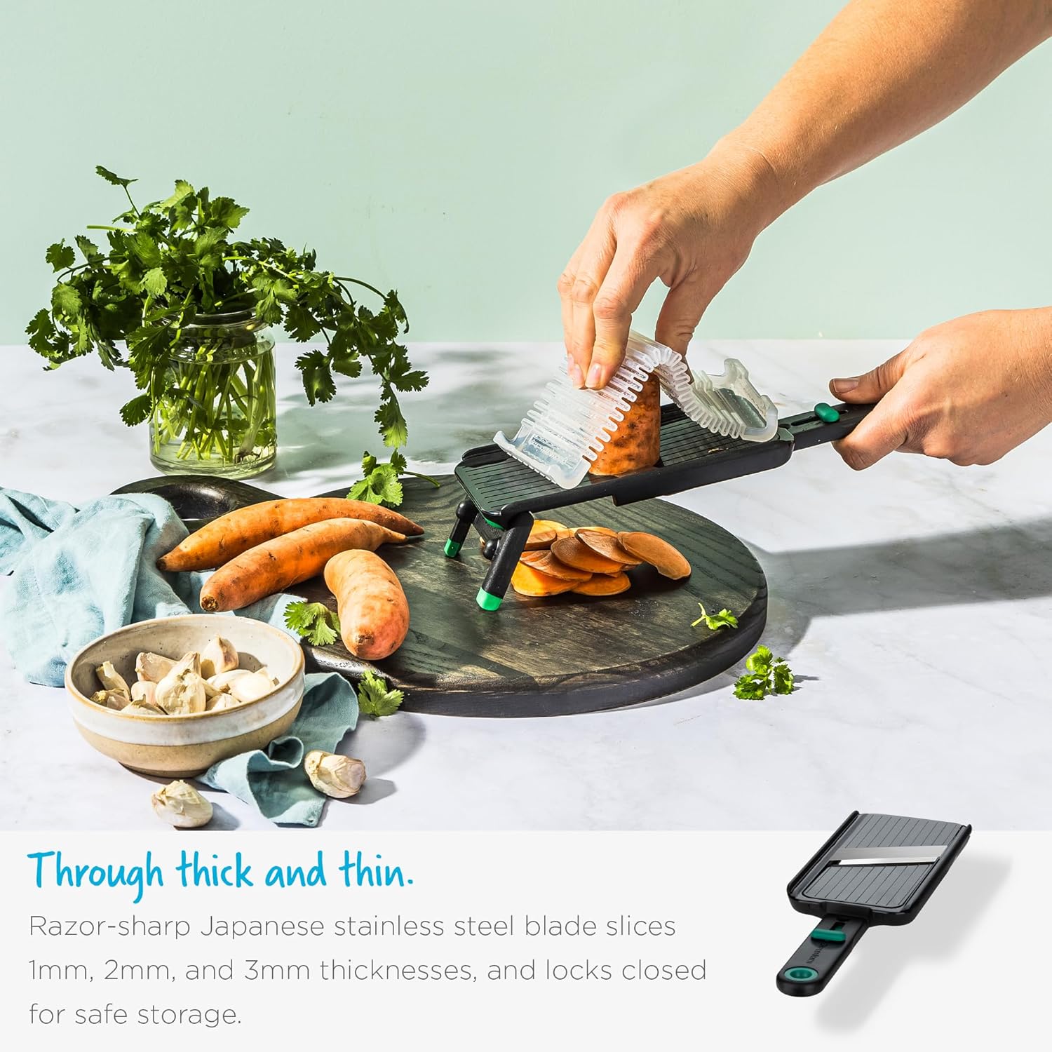 Razor-sharp Japanese stainless steel blade has adjustable thickness for 1mm, 2mm, and 3mm slices, and locks closed for safe-storage