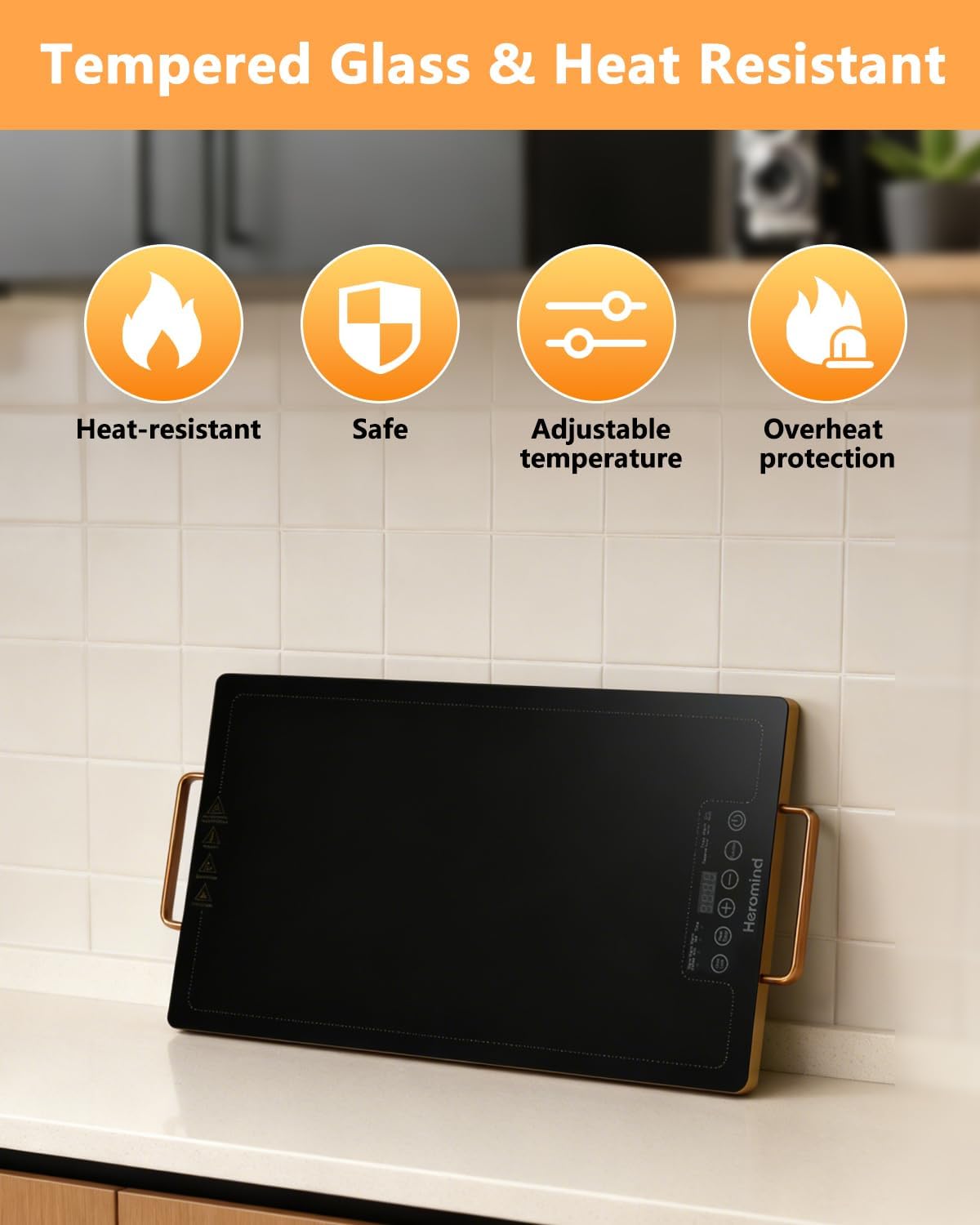 【Full-Surface Glass Top Heats Evenly for Any Dishware】Tempered glass top delivers full-surface, edge-to-edge heating for consistent warmth across plates, bowls, casserole dishes, and serving platters. Safe and compatible with ceramic, glass, porcelain, stainless steel, aluminum, and cast iron—perfect for soups, pasta, tacos, pizza slices, fries, cookies, and more.
