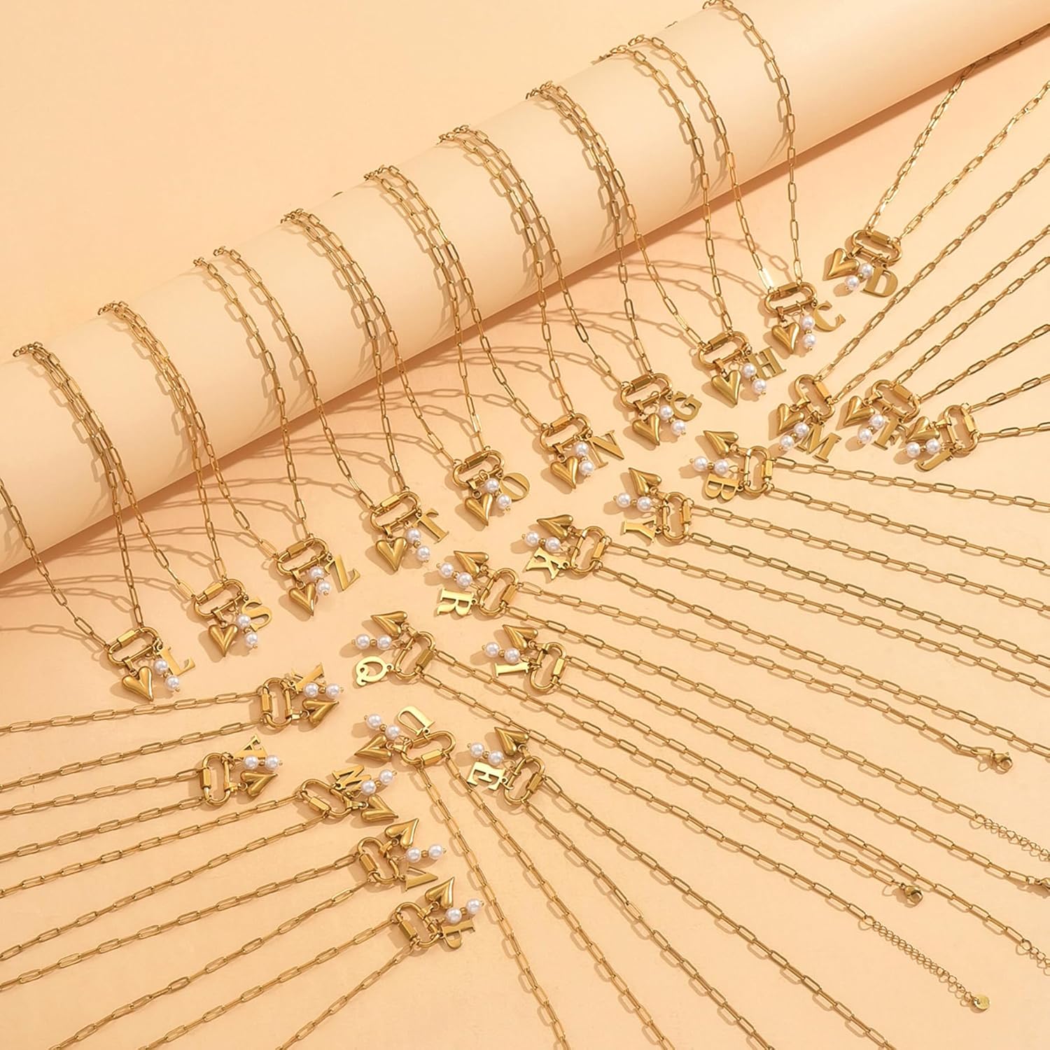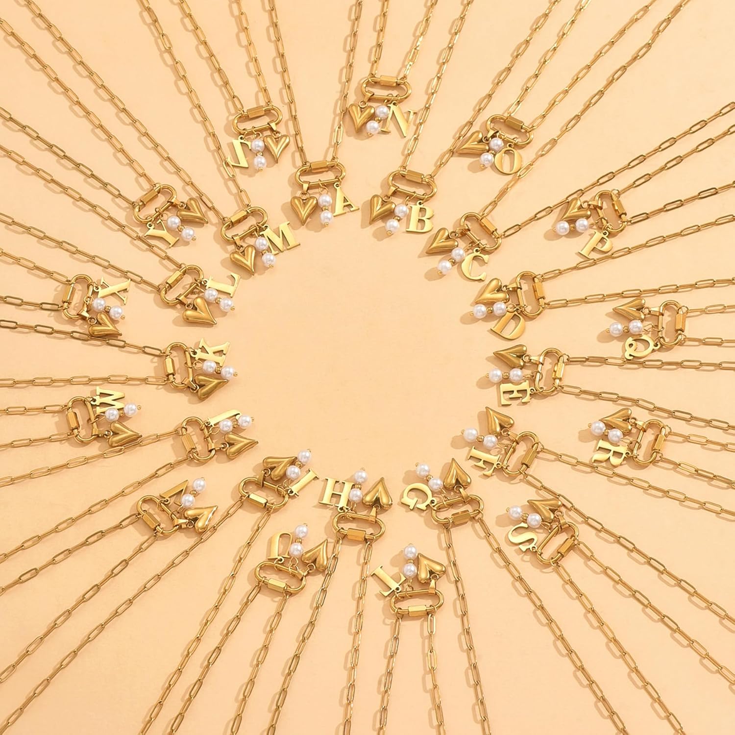 Gold Heart Initial Necklaces for Women 18K Gold Plated Dainty Pearl Letter Necklace Personalized Monogram Name A-Z Pendant Everyday Jewelry for Women