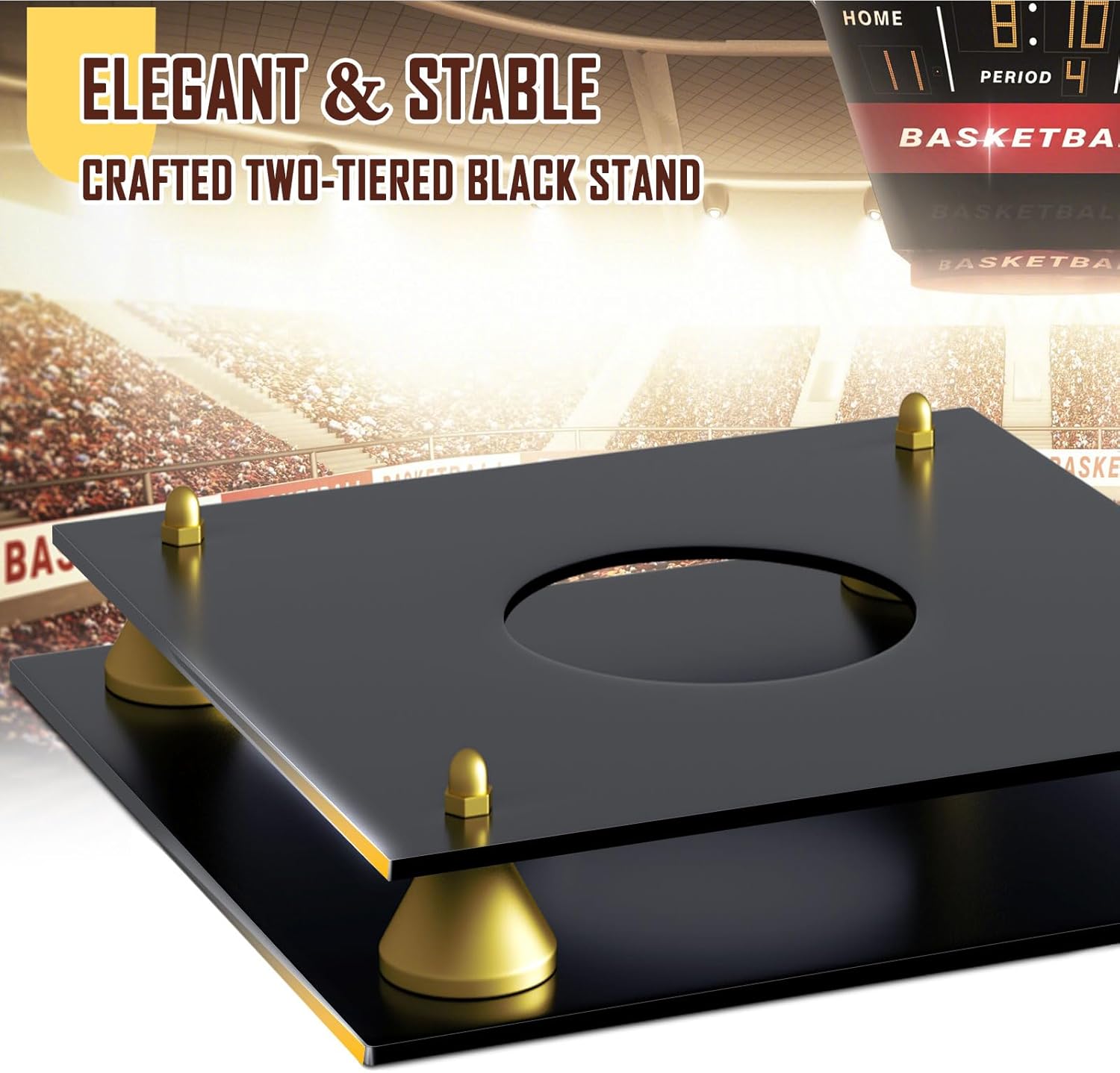 High Quality Material: The package includes 2 black plastic bases, 5 transparent acrylic panels, a screwdriver, and a pack of screws. This basketball display case is made of double-layer black plastic base with a glossy finish, and 5 transparent acrylic panels assembled with screws on the top. The 4 golden risers connecting the two black bases create a hollow layer in the middle, which provides a great visual