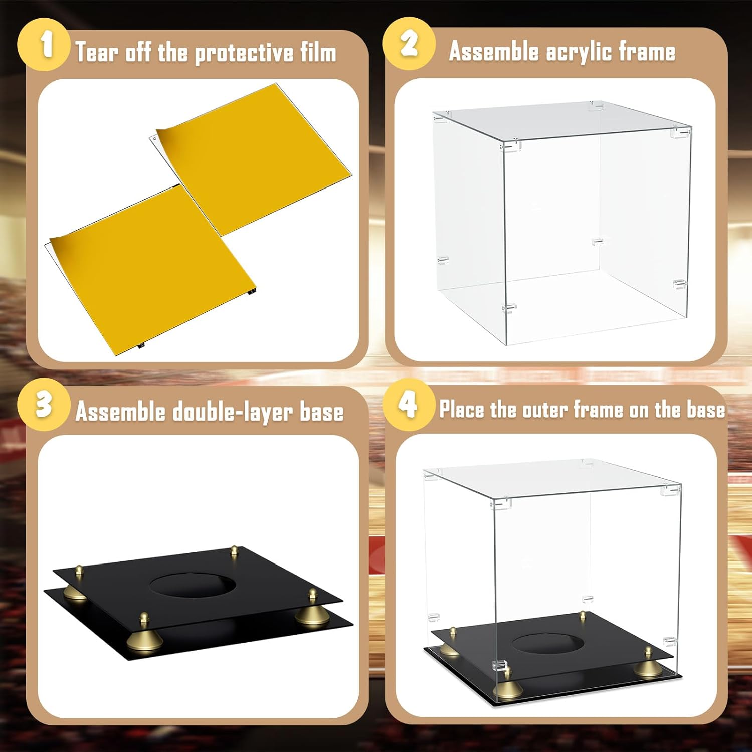 Easy to Assemble: Before assembly, please remove the yellow protective film on each part. First, install the double-layer black base. When installing, make sure to place the base with the circular groove on top of the one without the groove, and then connect them with screws. Then, assemble the transparent box by aligning the screw holes on the panels and tightening the screws. Finally, place the box on the base, and the basketball display case is ready to use