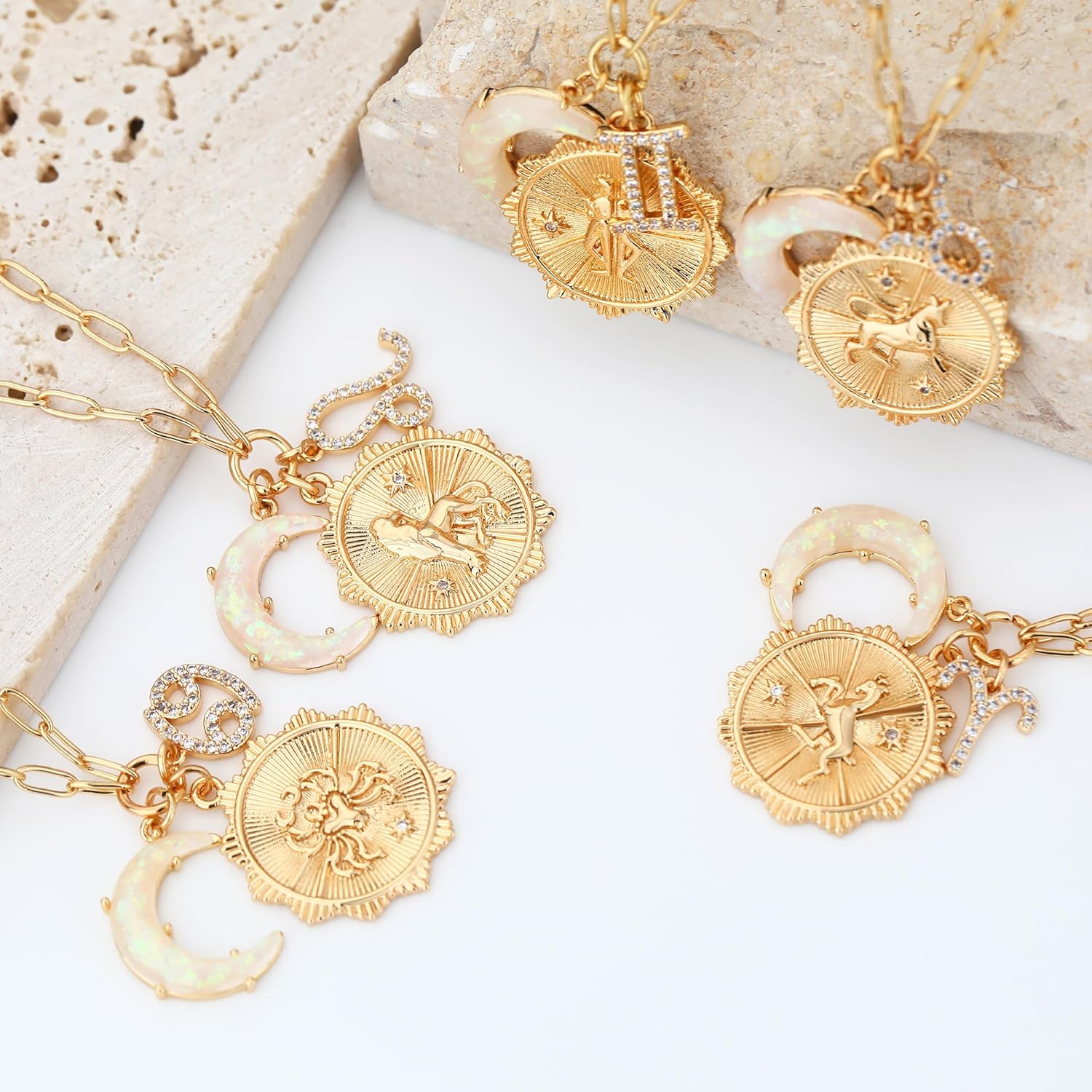 They are Dainty Gold Paperclip Chain 12 Constellation Horoscope Necklaces with Opal Crescent Moon Charm for Teen Girls