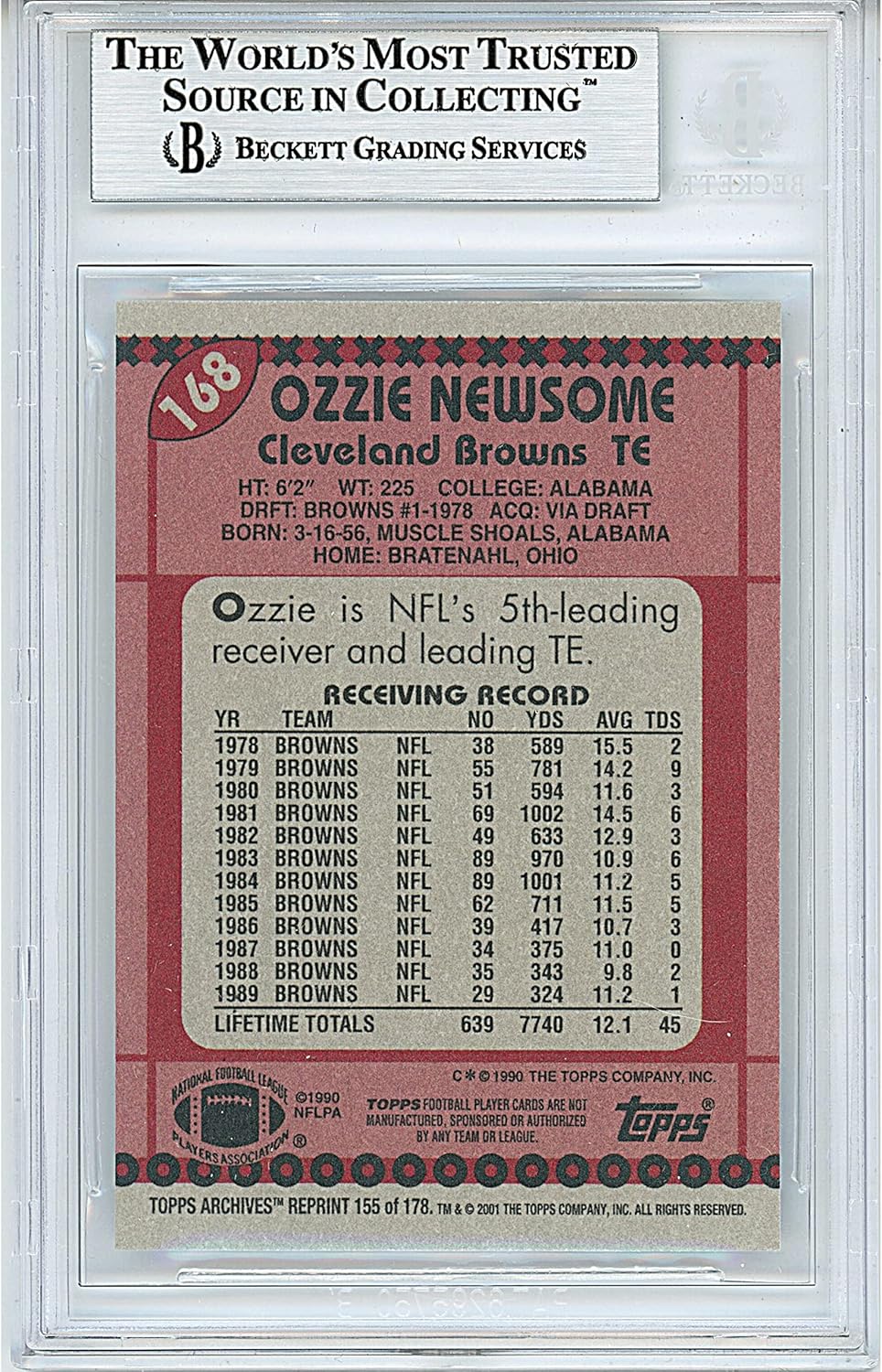 Experience a piece of football history with this authentically autographed Ozzie Newsome 2001 Topps Archives Football Card #155. Autographed by football legend Ozzie Newsome in black sharpie, this standard-sized 2.5″x3.5″ trading card is an extraordinary addition to any sports memorabilia collection. The signature on this card has been meticulously examined and authenticated by Beckett Authentication Services (BAS), ensuring its authenticity to the buyer. Protected within a BAS encapsulation measuring 3.25″ x 5″, this trading card is not only secure but also presentable. The encapsulation functions as the Certificate of Authenticity (COA), affirming that the buyer is acquiring a truly authentic item. The unique Beckett authentication number for this card is 00013190564. Ozzie Newsome, famed for his professional football career with the Cleveland Browns and his successful tenure as the general manager/Vice President for the Baltimore Ravens, is a celebrated figure in professional football. This signed card commemorates his remarkable career, making it a timeless keepsake for any football enthusiast.