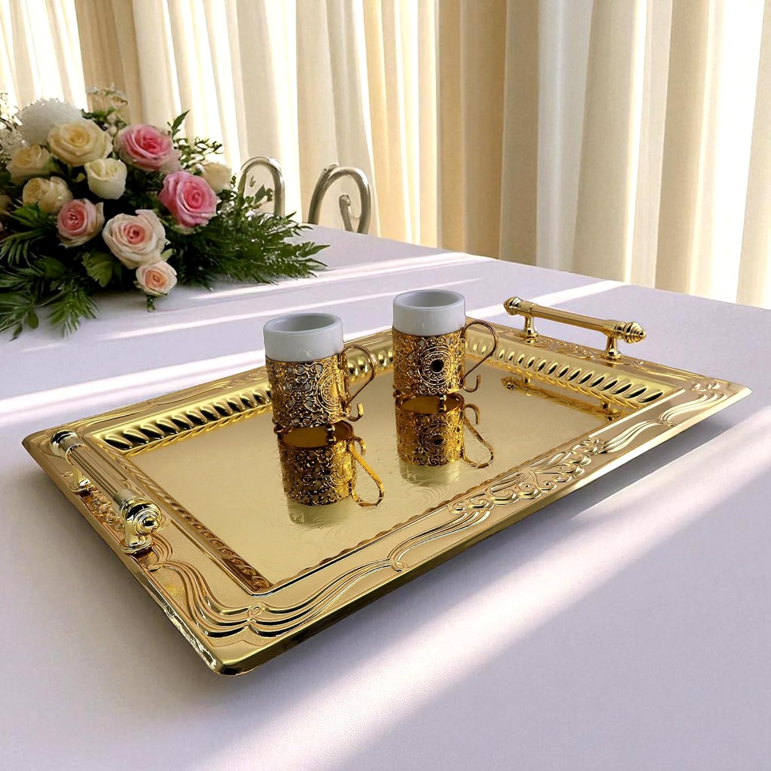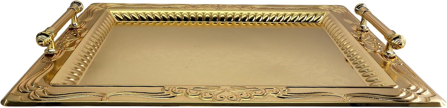 An effortlessly charming decorative piece at an affordable price. Featuring a gold-plated, high-quality iron finish with a mirrored reflection, it’s perfect for the holidays or everyday use. This multi-purpose serving tray is ideal for buffet and catering services.