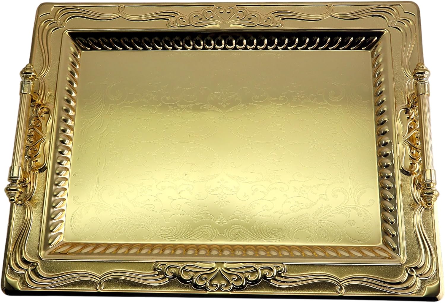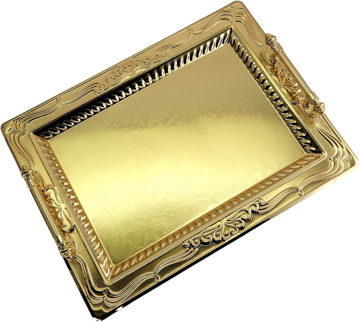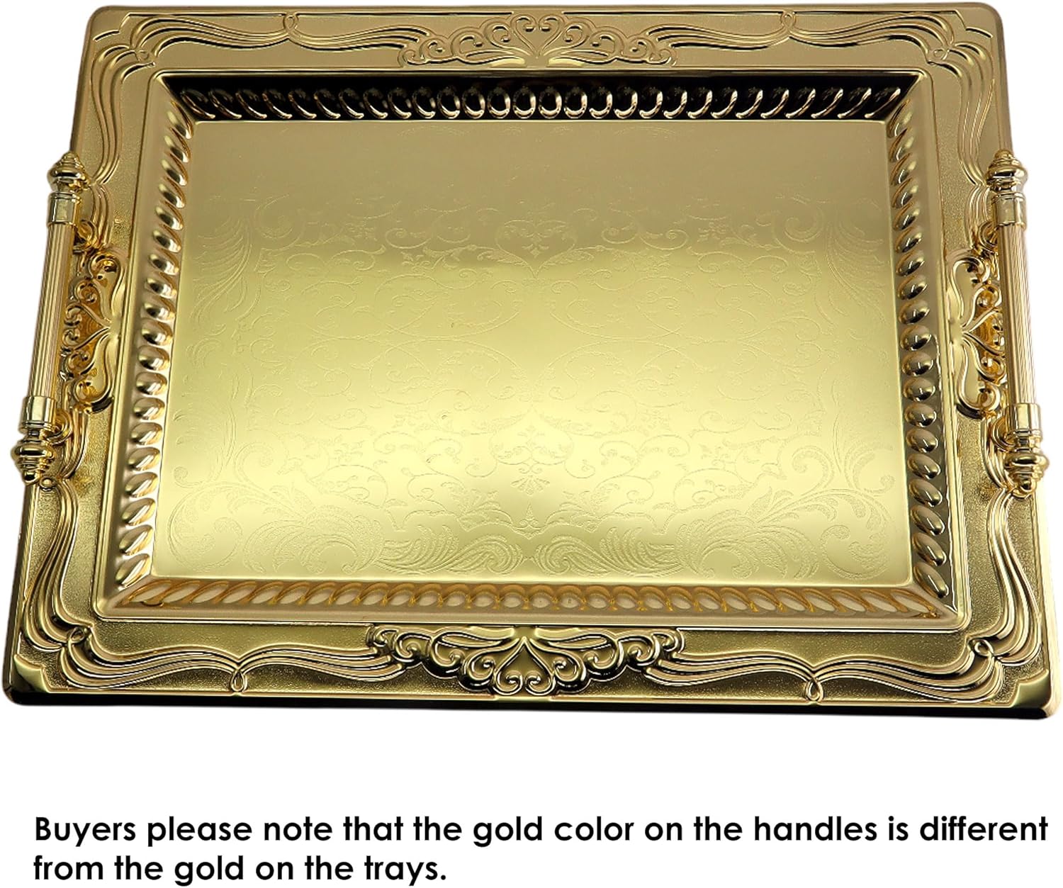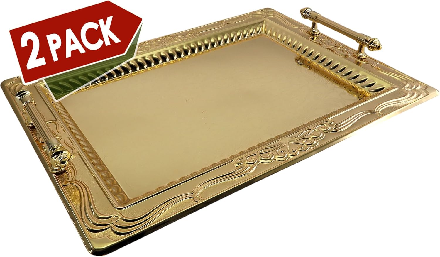 Pack of 2 elegant serving trays, outside dimension: 46 cm x 34.5 cm (or 18.1 inch x 13.6 inch), inside dimension: 35 cm x 23 cm (or 13.8 Inch x 9.1 Inch). (Tray size only; handle size is NOT included.)