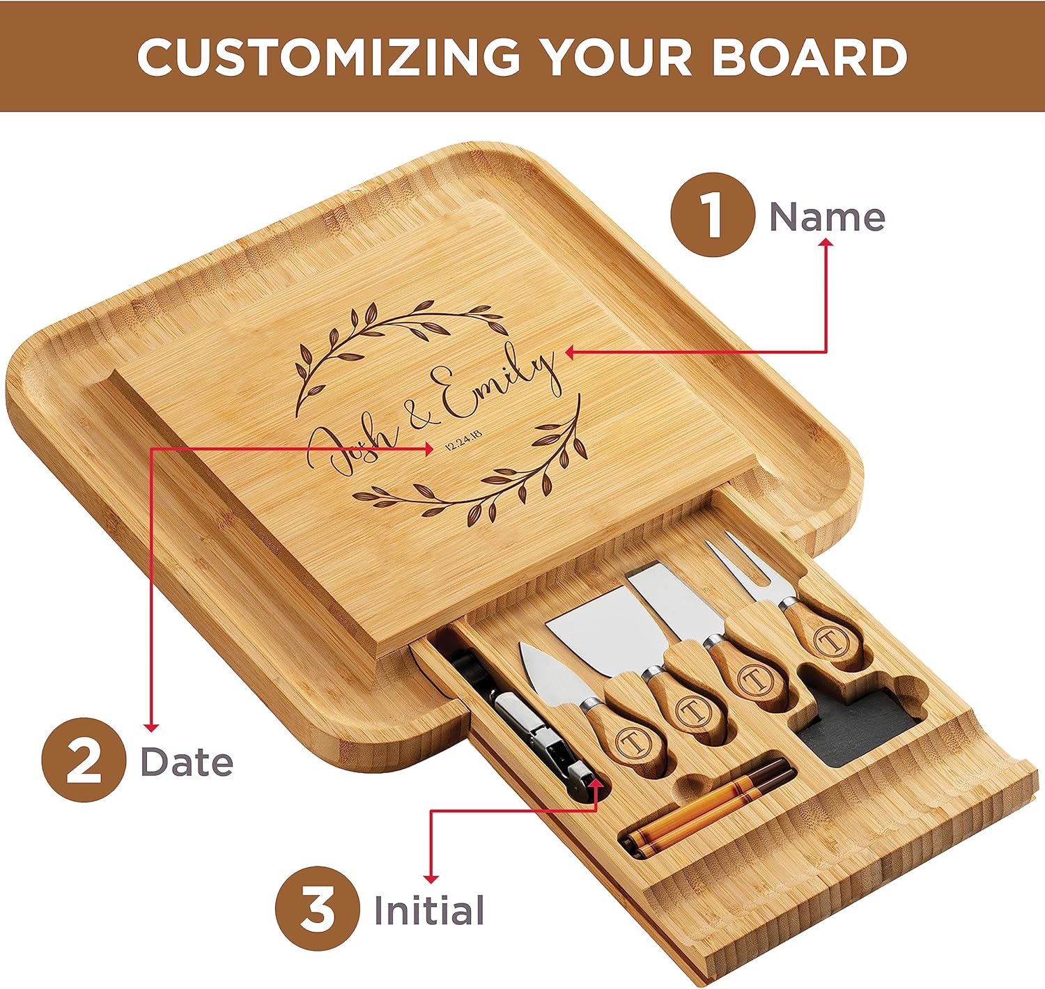 VERSATILE FOR ENTERTAINING & EVERYDAY USE: Designed for gatherings and casual dining alike, this charcuterie board is great for serving cheeses, meats, fruits, and more. It features a built-in groove for crackers and snacks, while the hidden drawer includes cheese knives, meat knives, and serving utensils. This personalized charcuterie board is the ultimate entertaining tool, making it a go-to for housewarming parties, engagement gifts for couples, and dinner events during the holidays