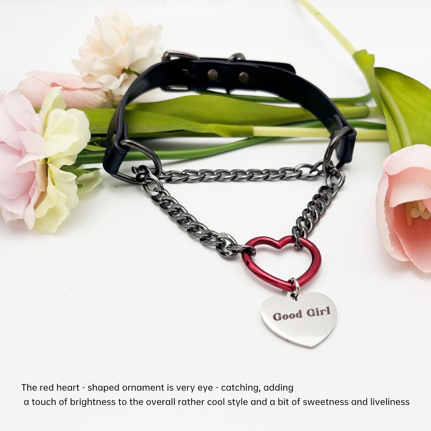 A unique mix of punk energy and playful romance, this leather slip chain choker features a heart O-ring, Cuban chain, and letter pendant. Designed for women who dare to stand out.