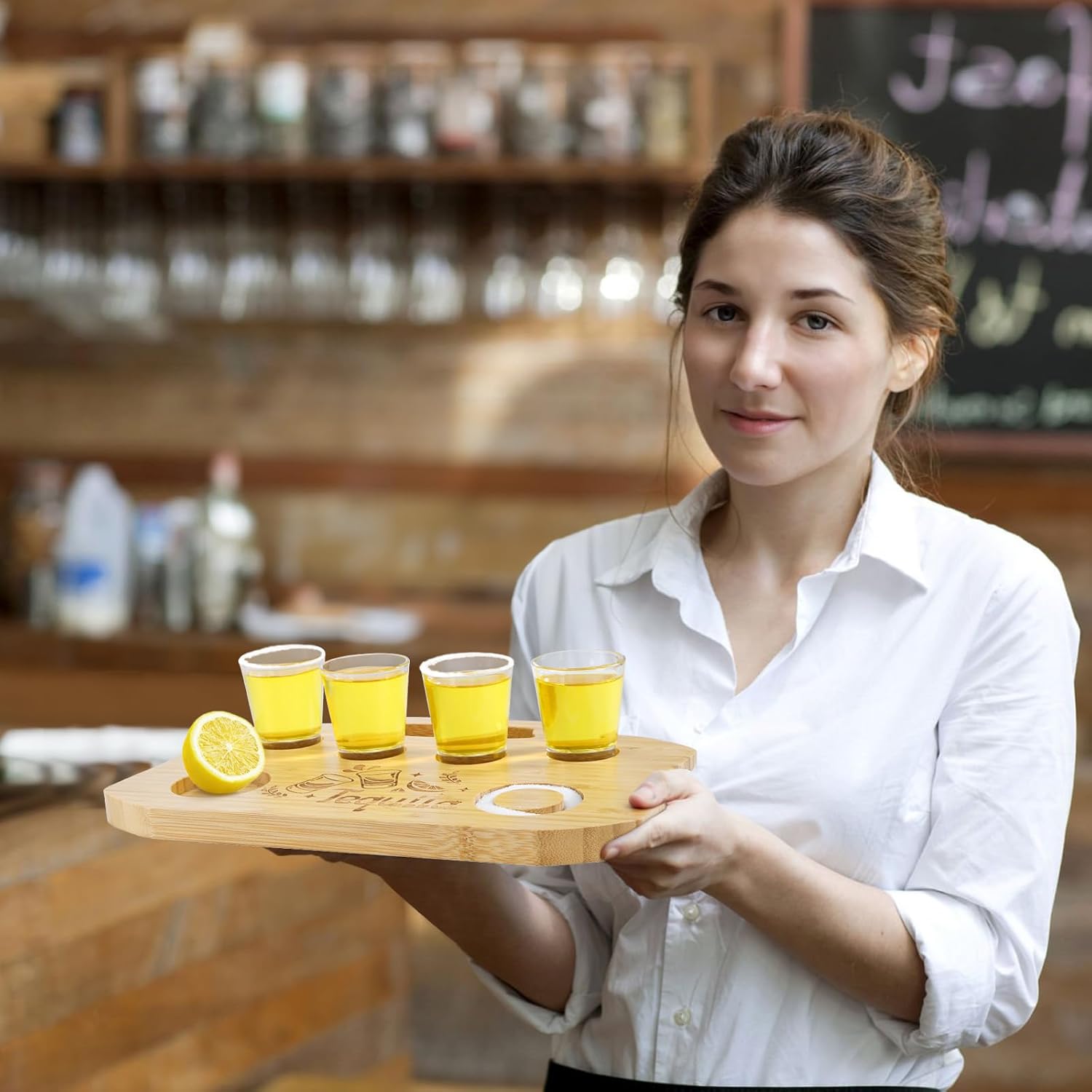 Bamboo Shot Glasses Serving Tray with Salt Rim