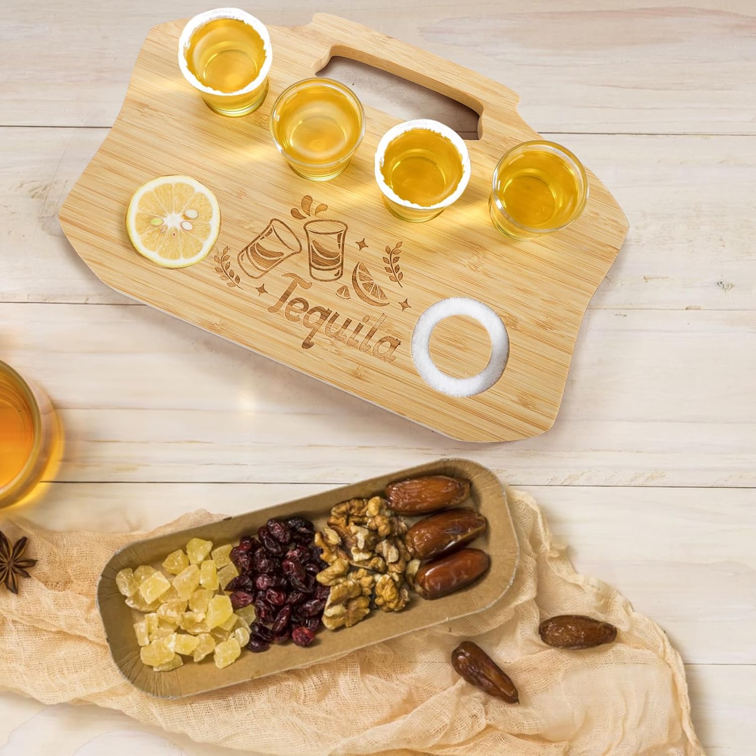 Considerate Design: This design combine the 4 cup hole tray, the salt trough, and the lemon bowl together. The salt hole is deep enough, so you don’t have to add salt frequently. The other lemon slice hole can also put larger cups. The pattern of this shot glass serving tray is cute and lovely, and will not wear or fade easily because it is engraved.