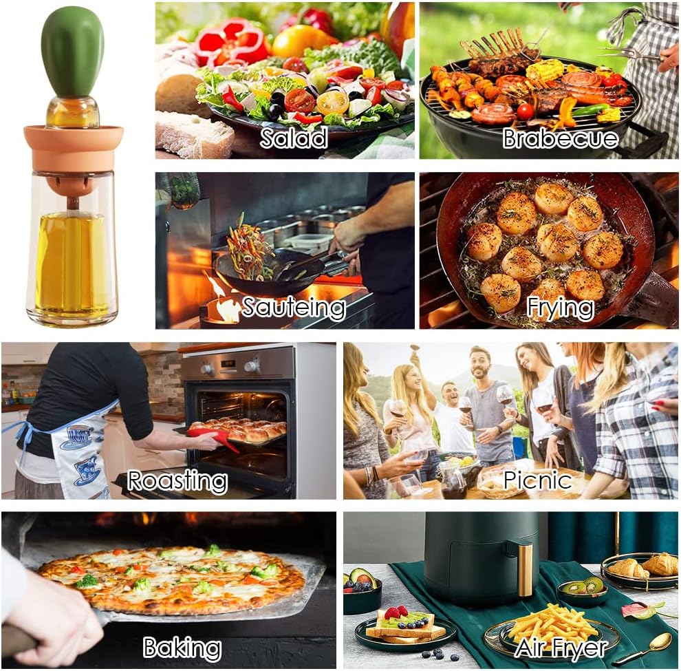 Special Unique Design – All-New 2-in-1 silicone oil basting brush with oil dispenser makes spray oil easy and quantitative. The oil brush spot is composed of silicone pipet head, AS transparent oil storage space with measurement scales, T shape silicone brush, PP filter funnel, PE straw and glass bottle. Just squeeze the silicone pipet head you can basting oil easily