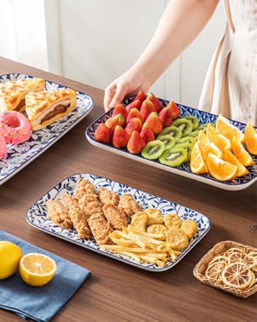 vancasso Serving Platters Set of 3, 16″/14″/12″ Inch Rectangular Trays – Serving Platter Extra Large, Ceramic Serving Dish Microwave & Dishwasher Safe (Vintage Blue A)