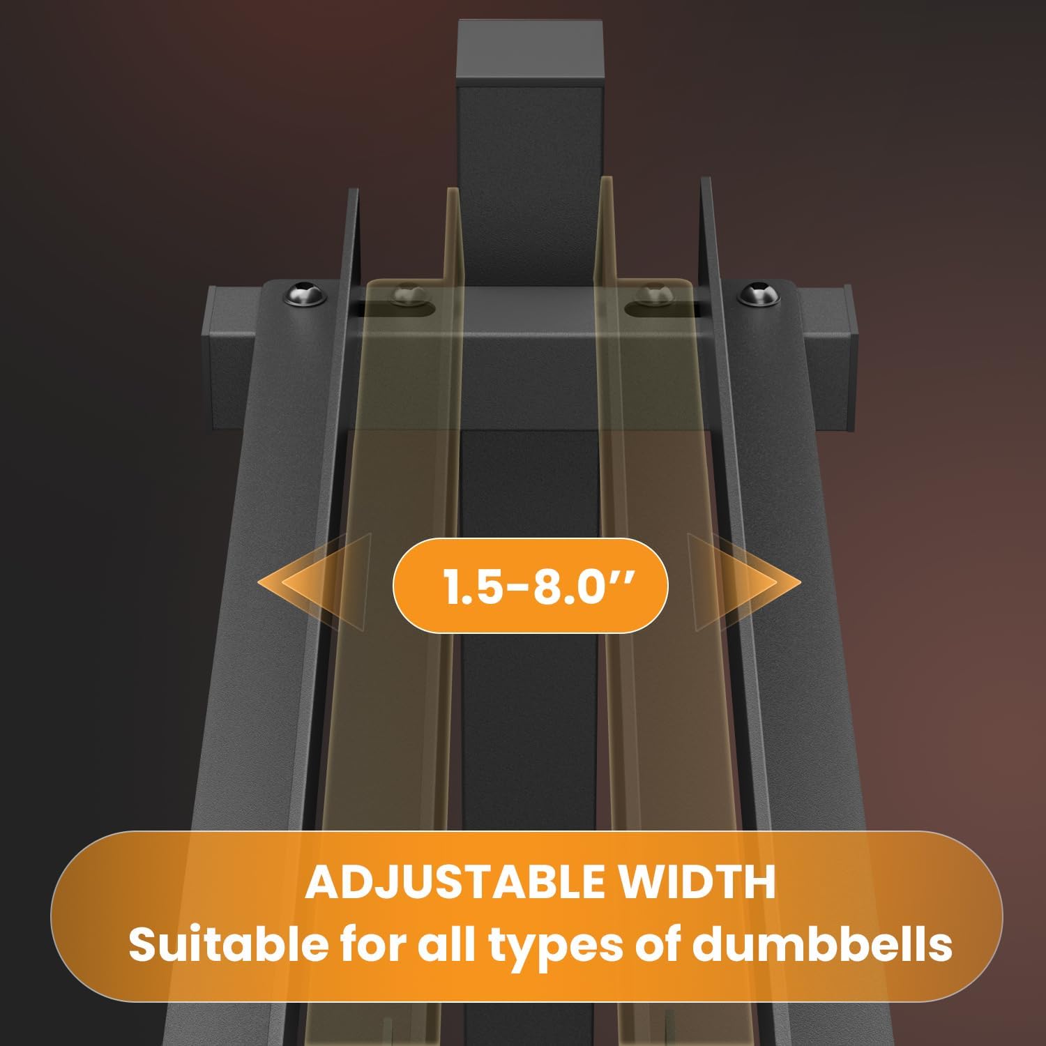 Adjustable Width Design: The dumbbell stand features adjustable dividers (1.5″-8″ width) accommodating everything from 5LB hex dumbbells to 75LB pro kettlebells. Strategic staggered steel brackets create effortless grip clearance – no more bruised knuckles when re-racking weights mid-workout! This weight stand adapts as your collection grows, eliminating costly upgrades.