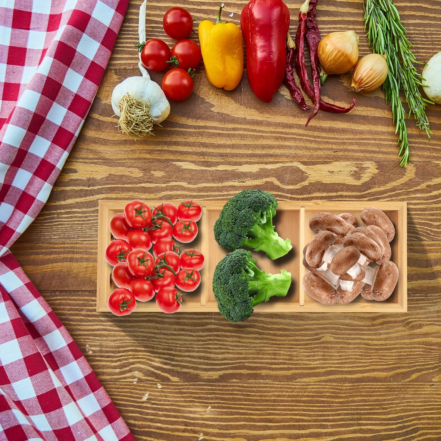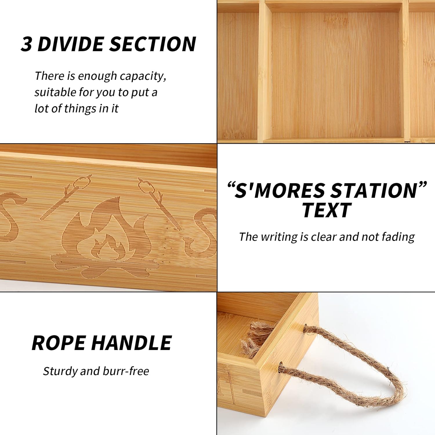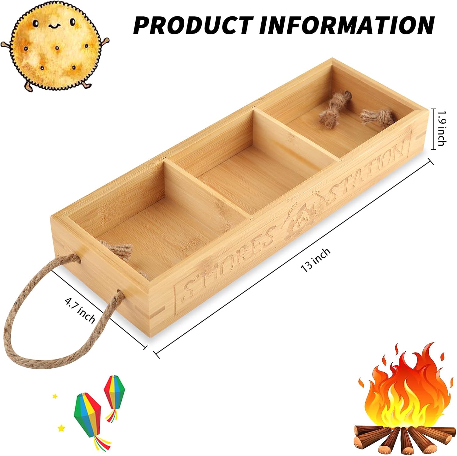 Classified storage design: The size of the s’mores station box is 13 inches (about 33 cm) (length) * 4.7 inches (about 11.9 cm) (width) * 1.8 inches (about 4.8 cm) (height), 3 divided parts have Enough capacity, suitable for you to put many things, such as cookie chocolate,Marshmallow,sausages, hot dogs, even vegetables or fruits.