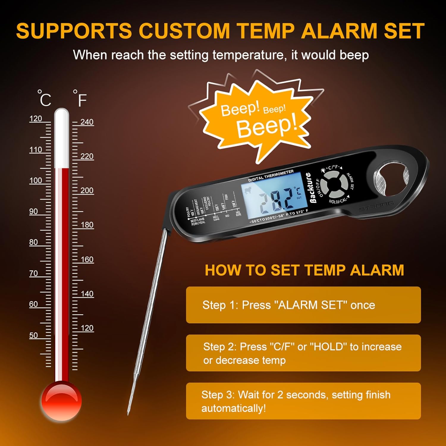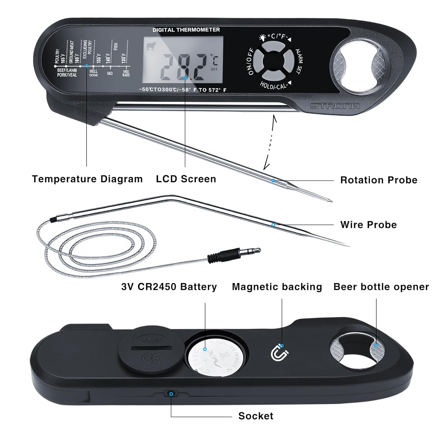 ⏰【Smart Alarm】No More Watching the Oven with our meat thermometer digital! Perfect Roasts Made Easy! The Smart Alarm alerts you when your roast is done. Customize doneness levels, get temperature recommendations, and receive an alarm when it’s ready. With real-time readings every 2seconds, enjoy stress-free cooking and perfectly cooked meals!