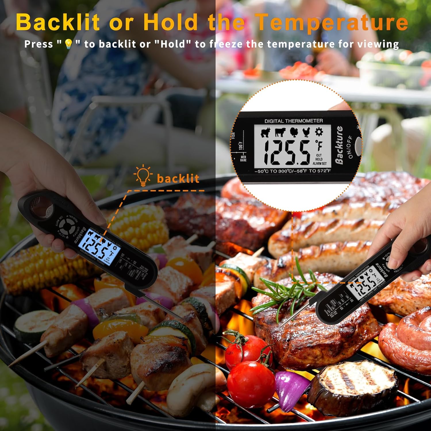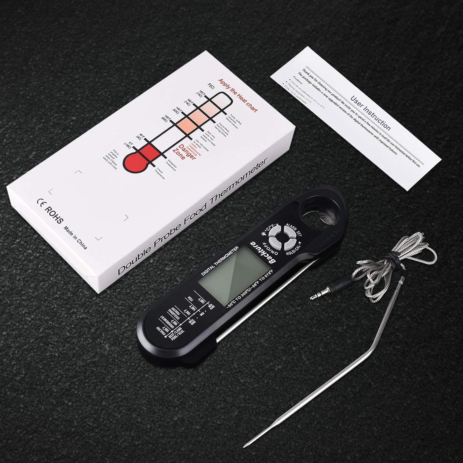 Wire Digital Meat Thermometer, Instant Read, Long Wire Range, Alarm, Backlit, High-Temp-Resist Food Thermometer, Kitchen Gadgets, Grilling BBQ Accessories for Smoker, Cooking, Oven, Rotisserie, Black