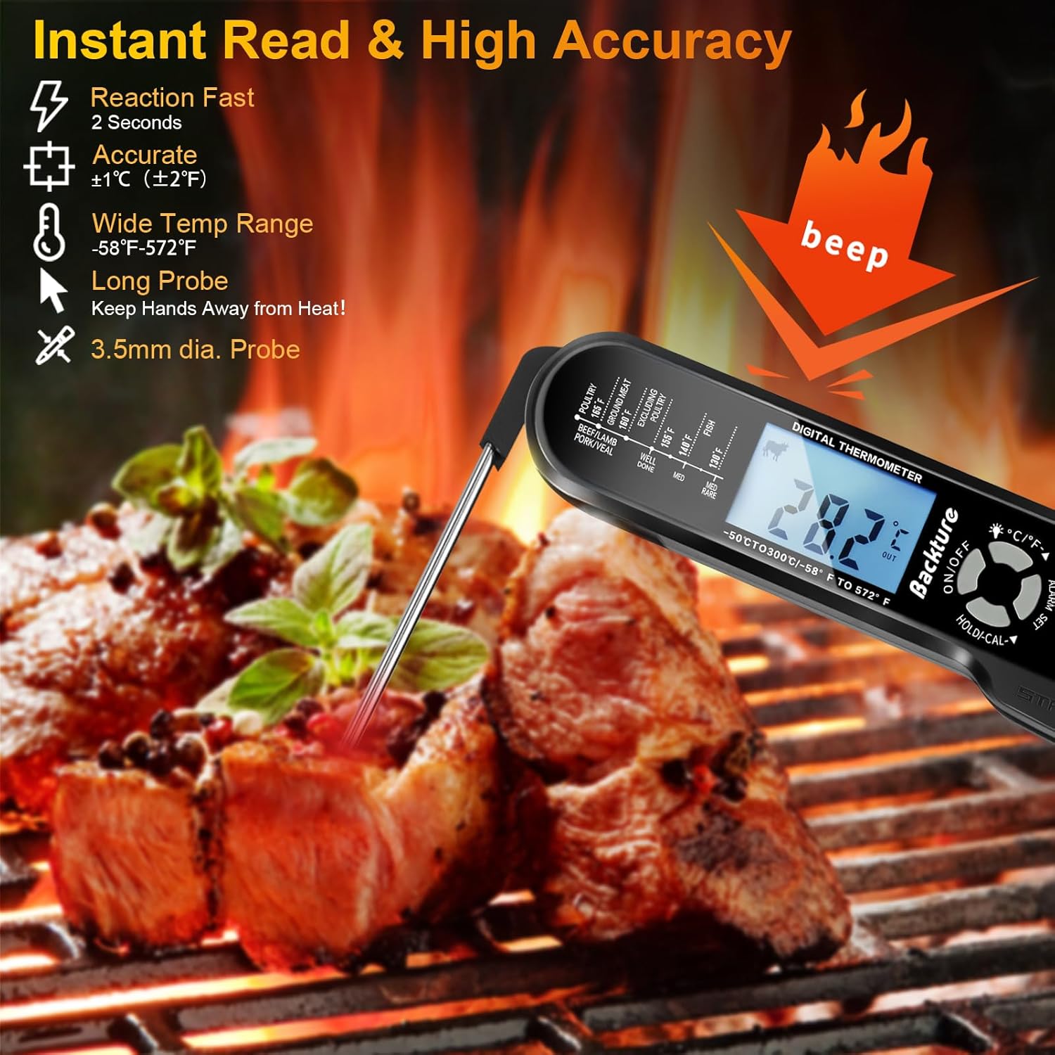 🎯【High Accuracy Probe & LCD Repeater】No More Overcooking or Undercooking with our meat thermometer! Achieve flawless results with our high-accuracy probe and LCD repeater. Sensors are accurate to ±1°C/±1.8°F, eliminating guesswork. The LCD screen shows meat temperature, so you can easily track doneness.