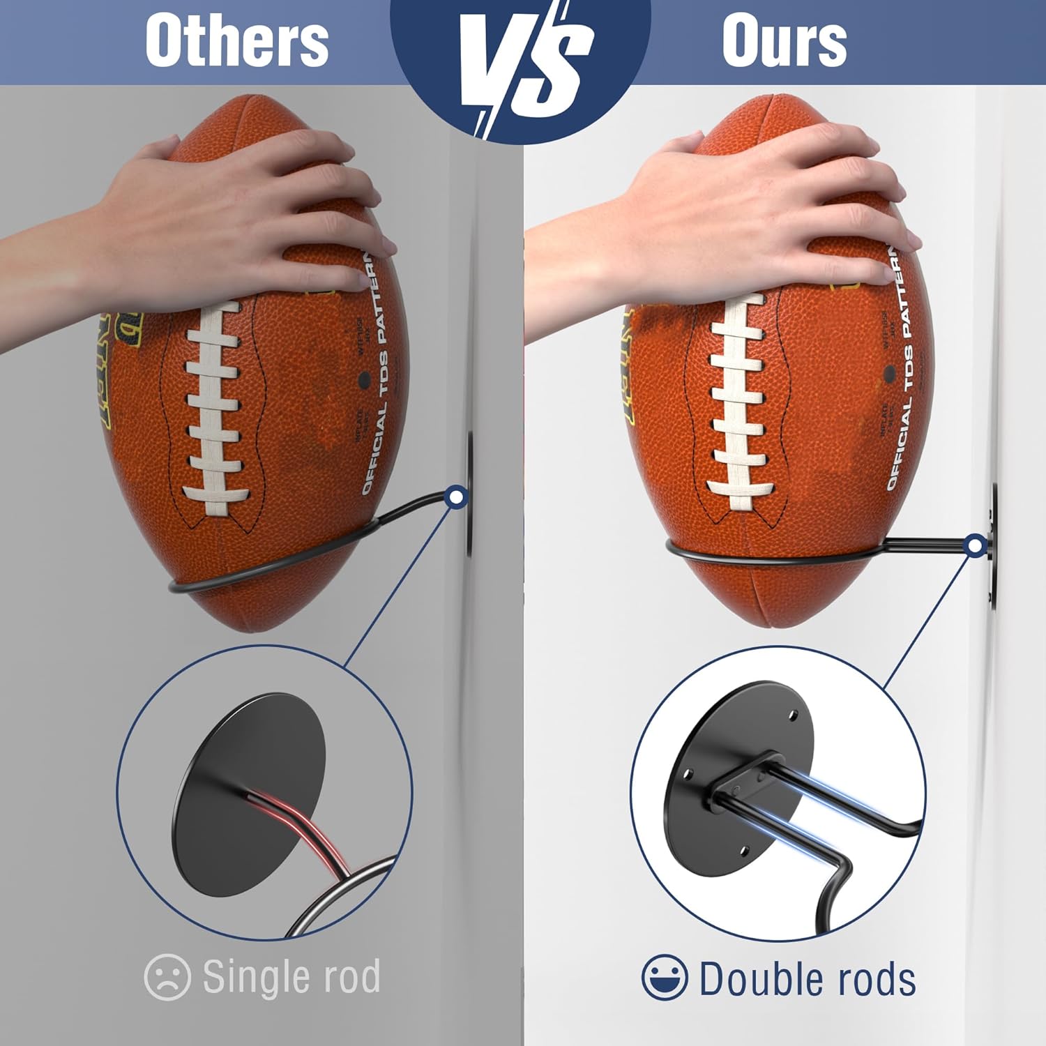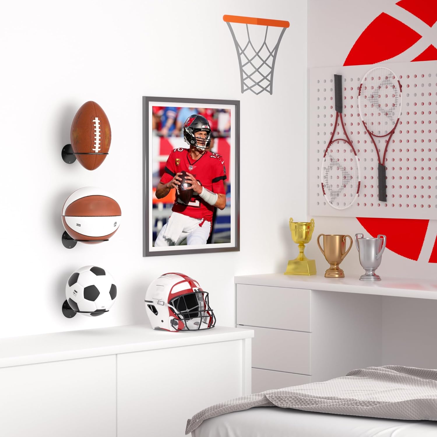 Product size: The wall mounted ball rack measures 8.2 x 4.9 inches and is suitable for most ball games, including basketball, rugby, football, and volleyball. The minimalist design style is suitable for the walls of bedrooms, storage rooms, basements, sports bars, offices, and garages, allowing every ball to be well displayed