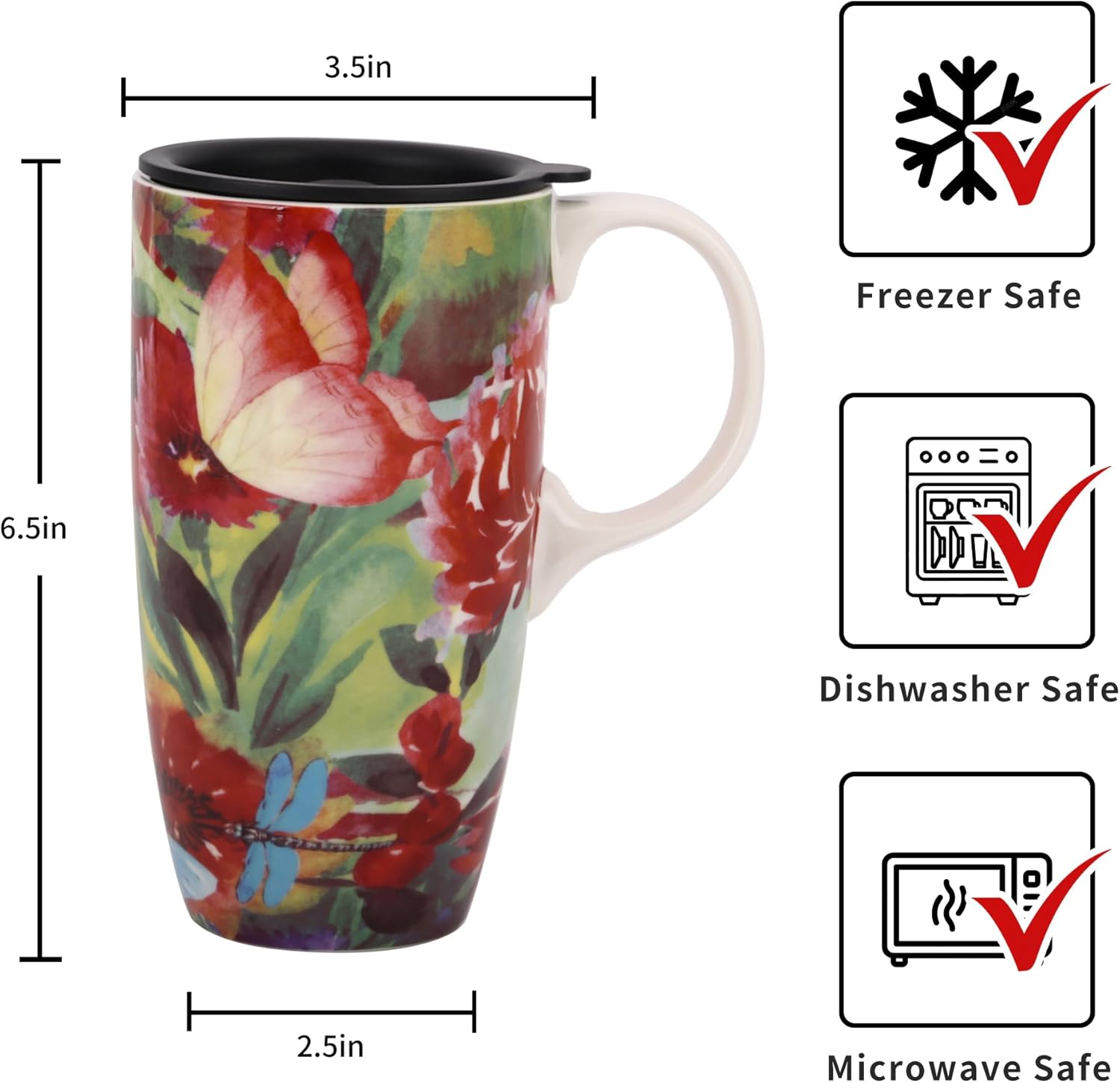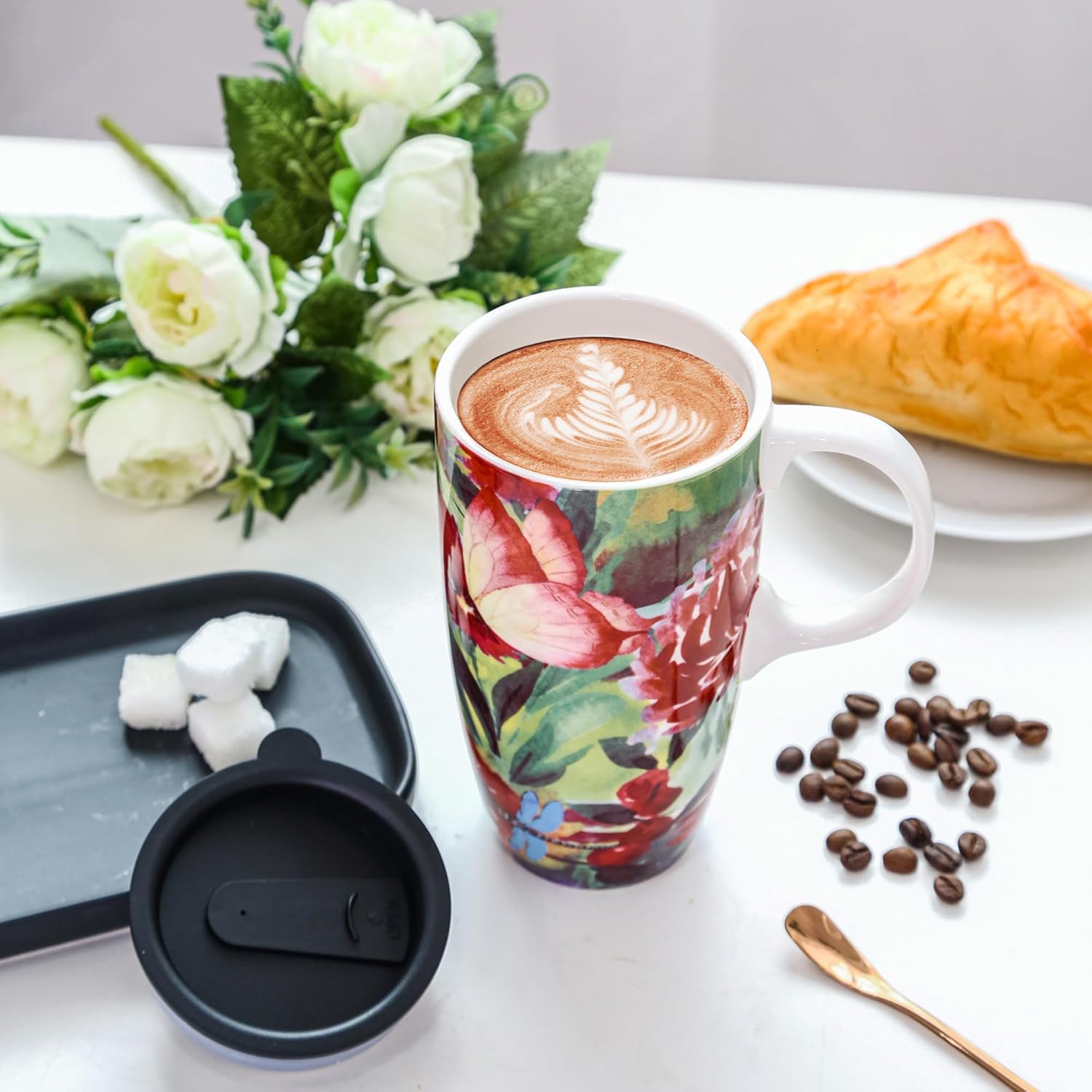Ceramic Coffee Mug Travel Cup with Lid for Home & Office, 17oz Porcelain Tall Tea Cup with Handle, Red Flower Art Mug in Color Box, 6.5″ H