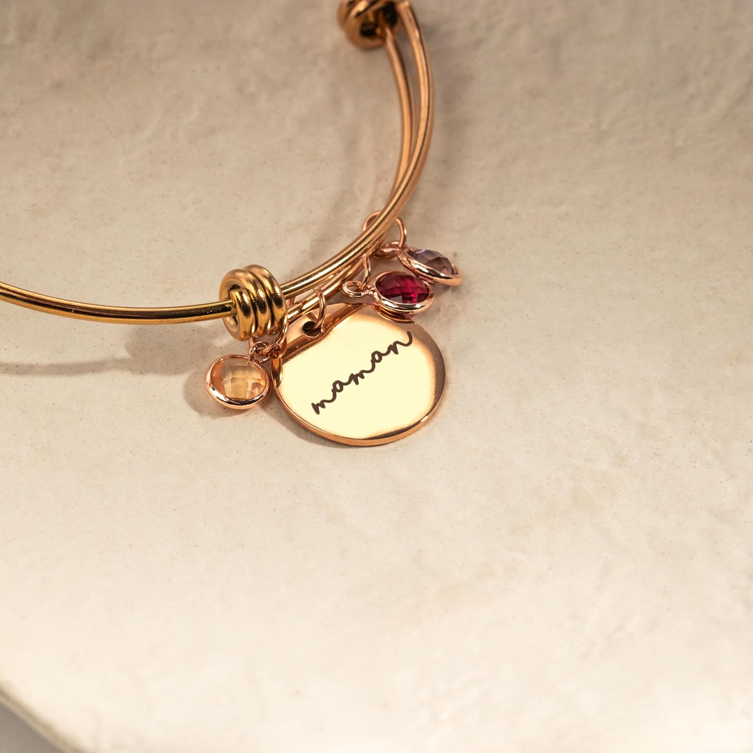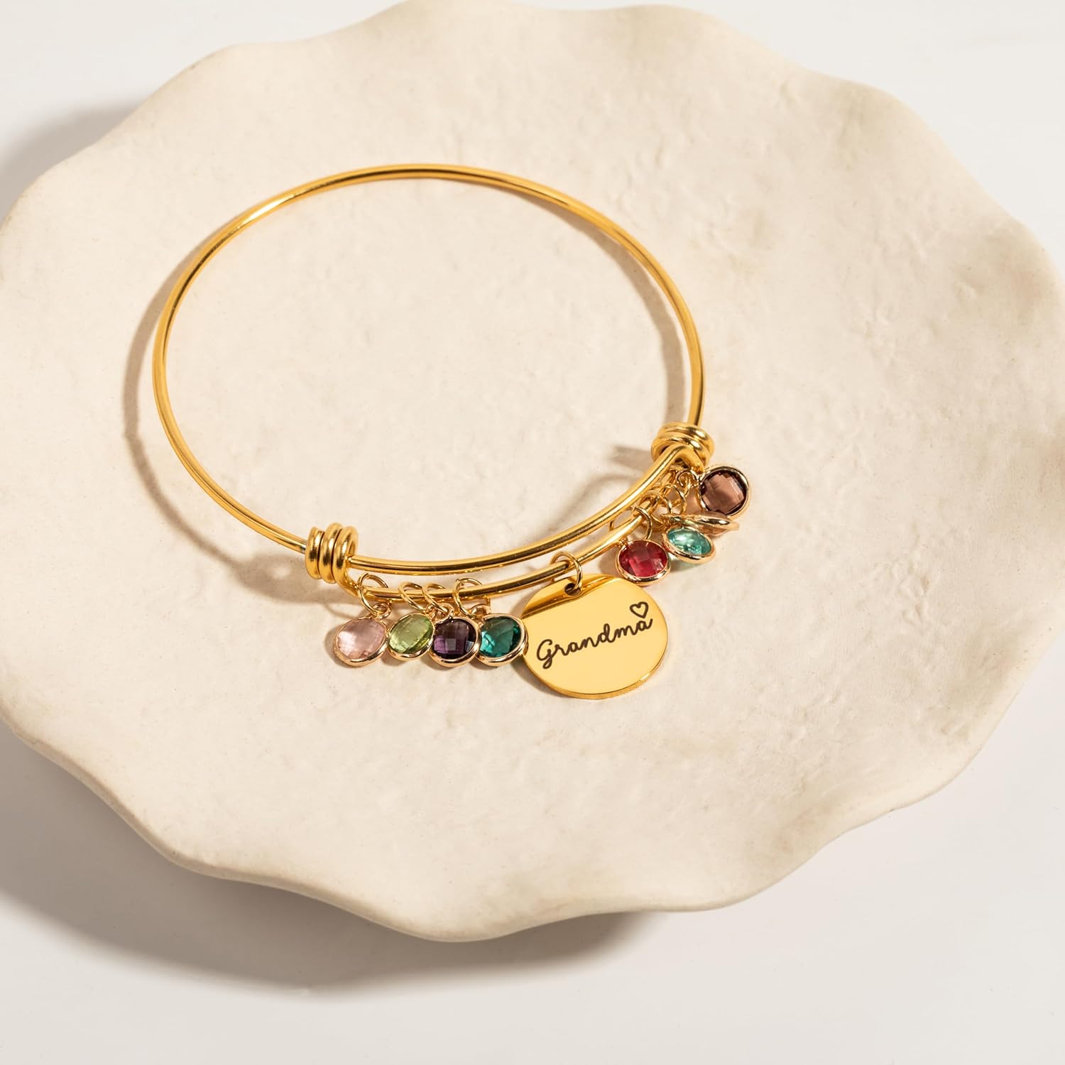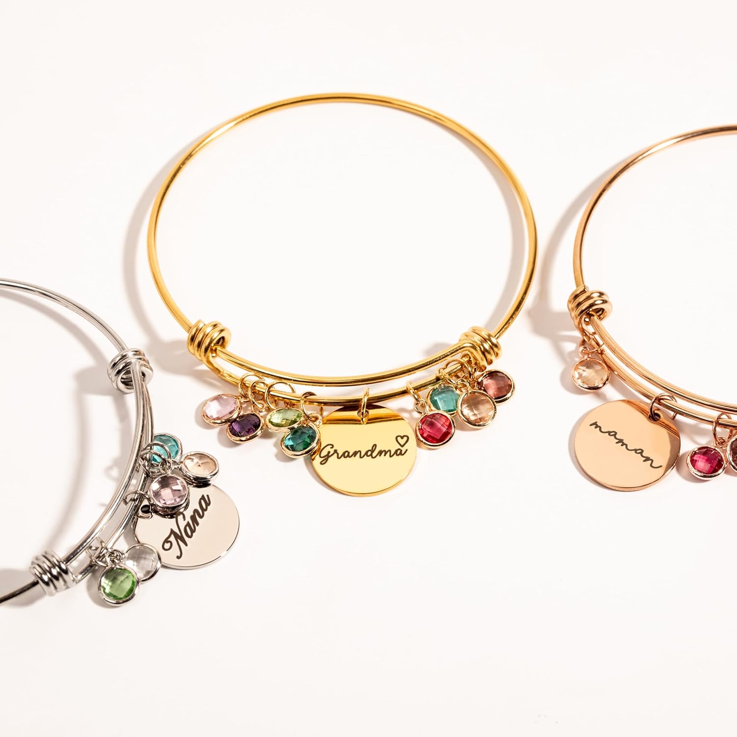 Personalization Engraving & Birthstones Size Disc Pendant: approx. 0.7” in diameter (18mm), -Birthstone Charm: 0.35″ x 0.27″ (9mm×7mm), -Bracelet Width H: approx. 2.5” in diameter (6.35 cm), -Bracelet Length : approx. 8” (20cm) Material Gold Plated, Silver Plated & Rose Gold Pleated Stainless steel. This is better quality than brass or alloy materials. It’s built to last as well with tarnish resistant materials! Perfect Gift Personalized jewelry that makes the perfect gift for family and friends and comes in a cute box for easy storage or gifting. This special and meaningful gift can be given to mother, sister, best friends, girlfriend, coworker, or anyone else you cherish. You can give this jewelry on various anniversaries and occasions, like for Mother’s Day, Valentine’s Day, Birthday, Christmas, Halloween, Wedding Day, etc. Necklace Care Tips We recommend taking your jewelry off for the shower, pool or spa. Avoid direct contact with perfumes, body oils, and other chemicals, including household cleaners. Also remove when sleeping or exercising. Handmade Item We believe that it is of the utmost importance to ensure that our customers are satisfied with their one-of-a-kind pieces. We hold our customers near and dear to our hearts and are more than willing to move heaven and earth to make sure your shopping experience is unforgettable!