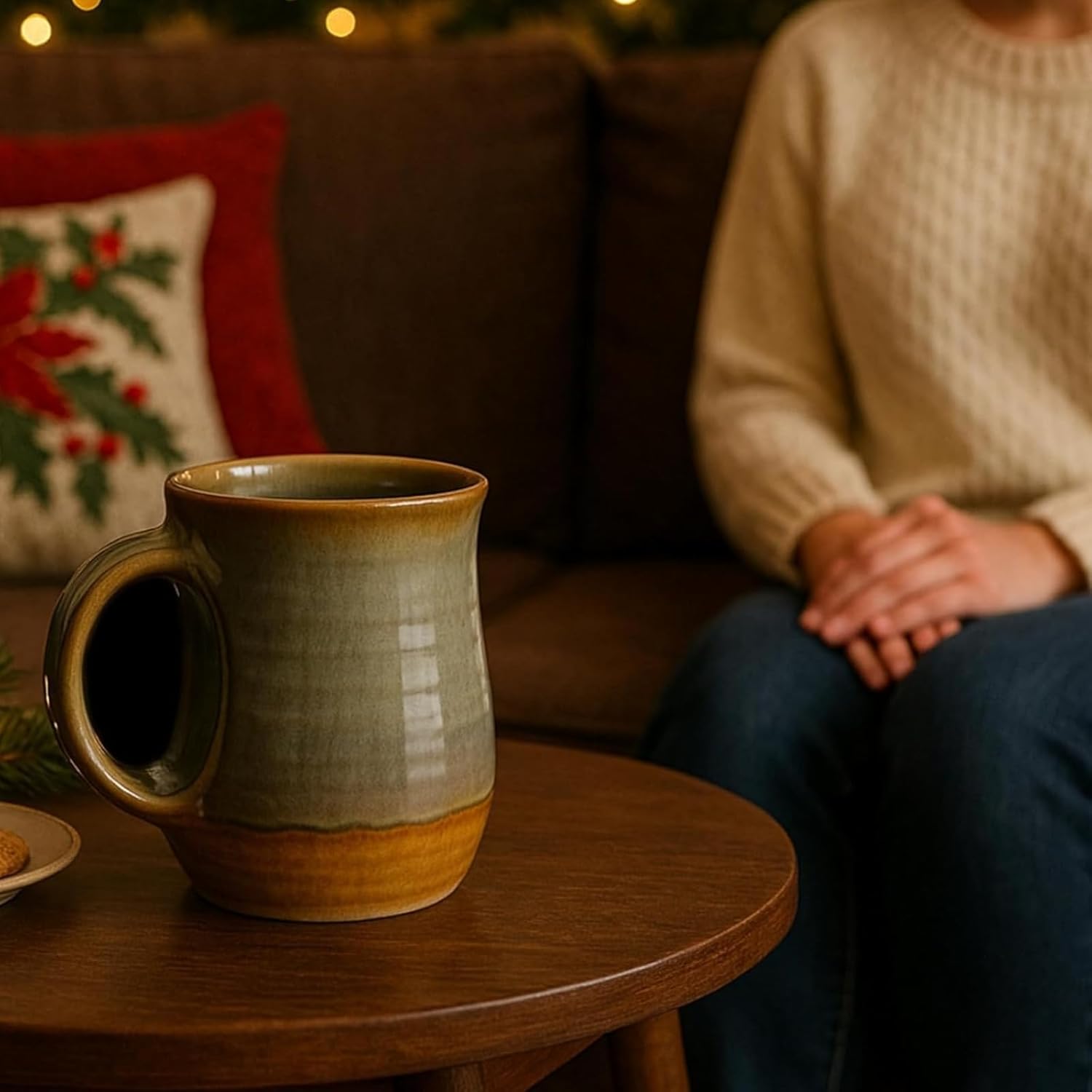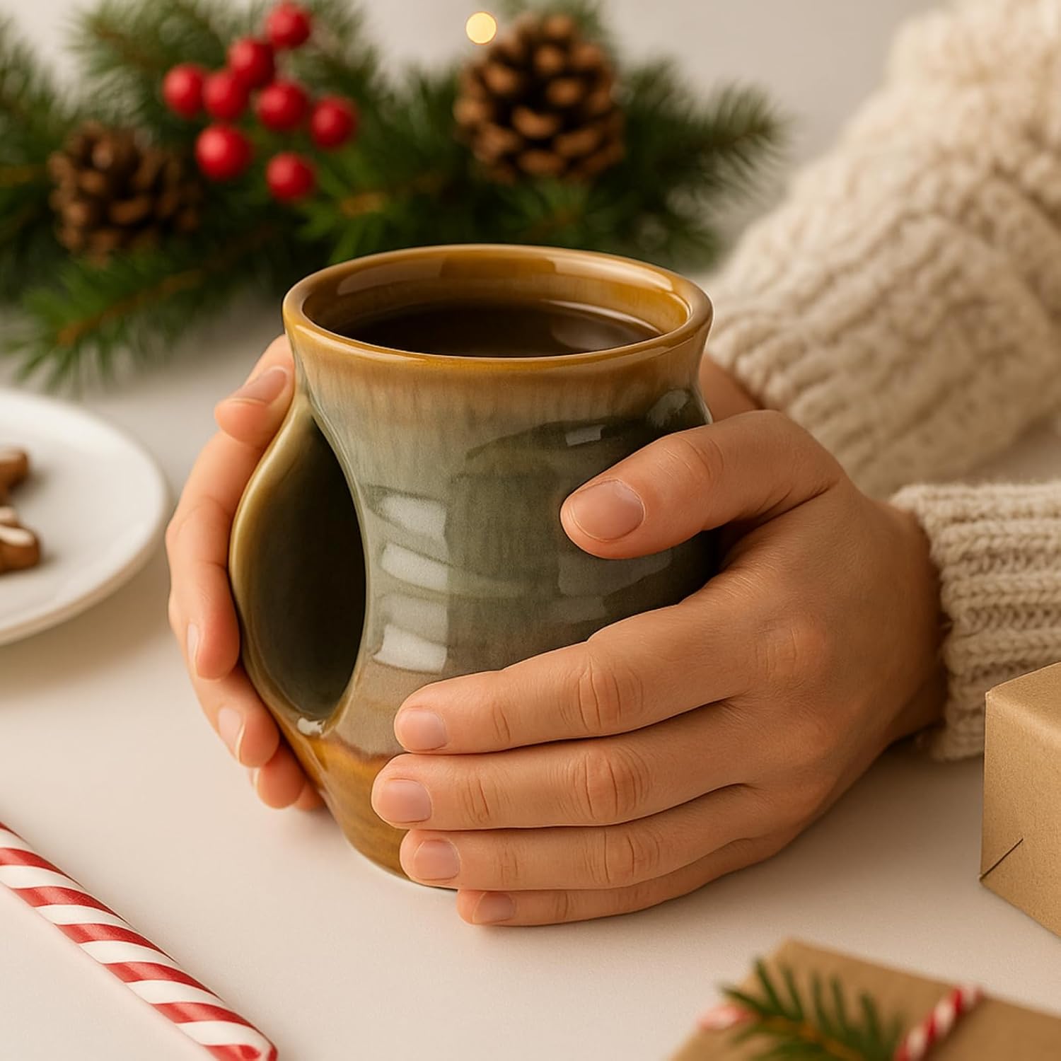 Unlike traditional coffee mugs, this mug is designed with an ergonomic contoured pocket which allows you to wrap your right hand in comforting warmth while enjoying your favorite beverage.