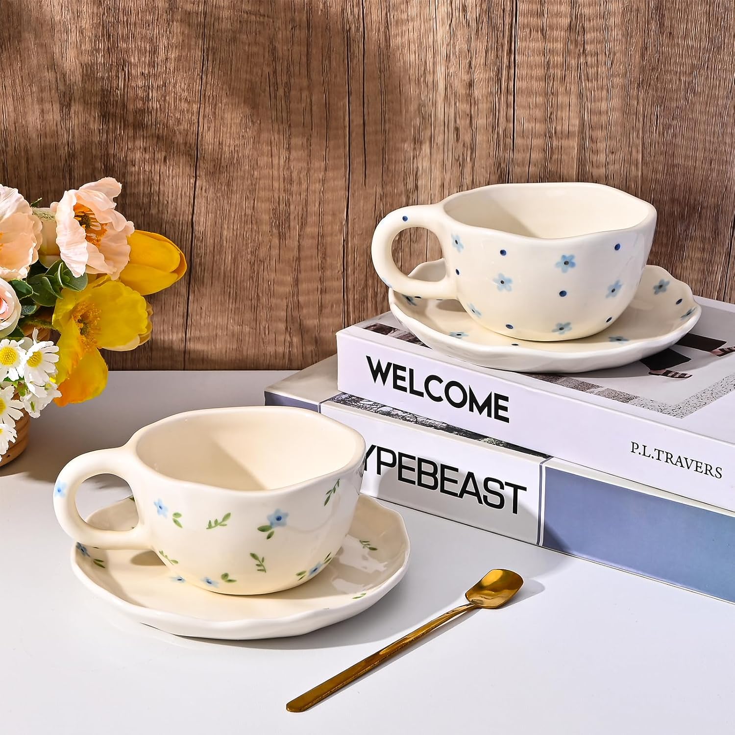 Koythin Ceramic Coffee Mug with Saucers, Handmade Flowers Mugs, Cute Cup for Girl Women, Aesthetic Tea Milk Cup with Handle, 8.5 oz/250 ml for Latte, Cocoa, Office, Home (Dot Blue Flower)