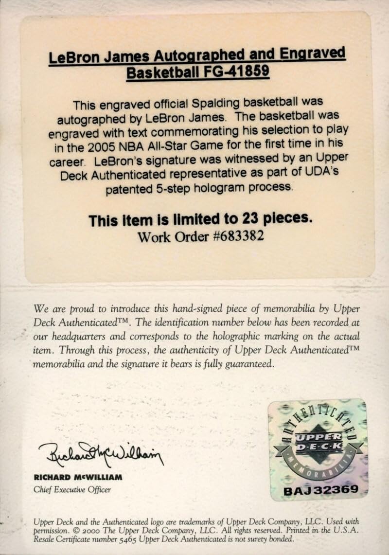 Lebron James First All Star Game Signed NBA Game Basketball Upper Deck UDA #5/23 . If a product is unsigned or non game-used, a hologram will not be included. LeBron James memorabilia. Los Angeles Lakers memorabilia.