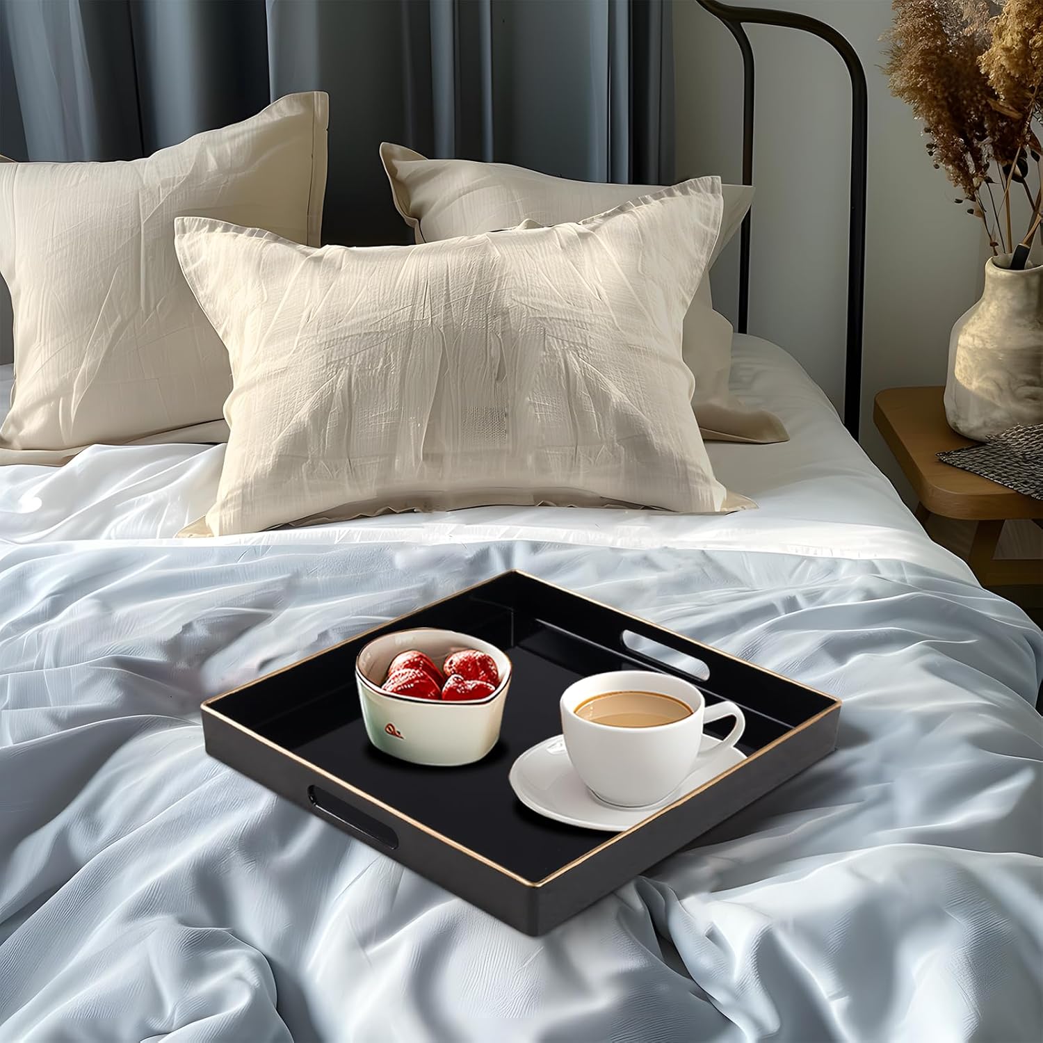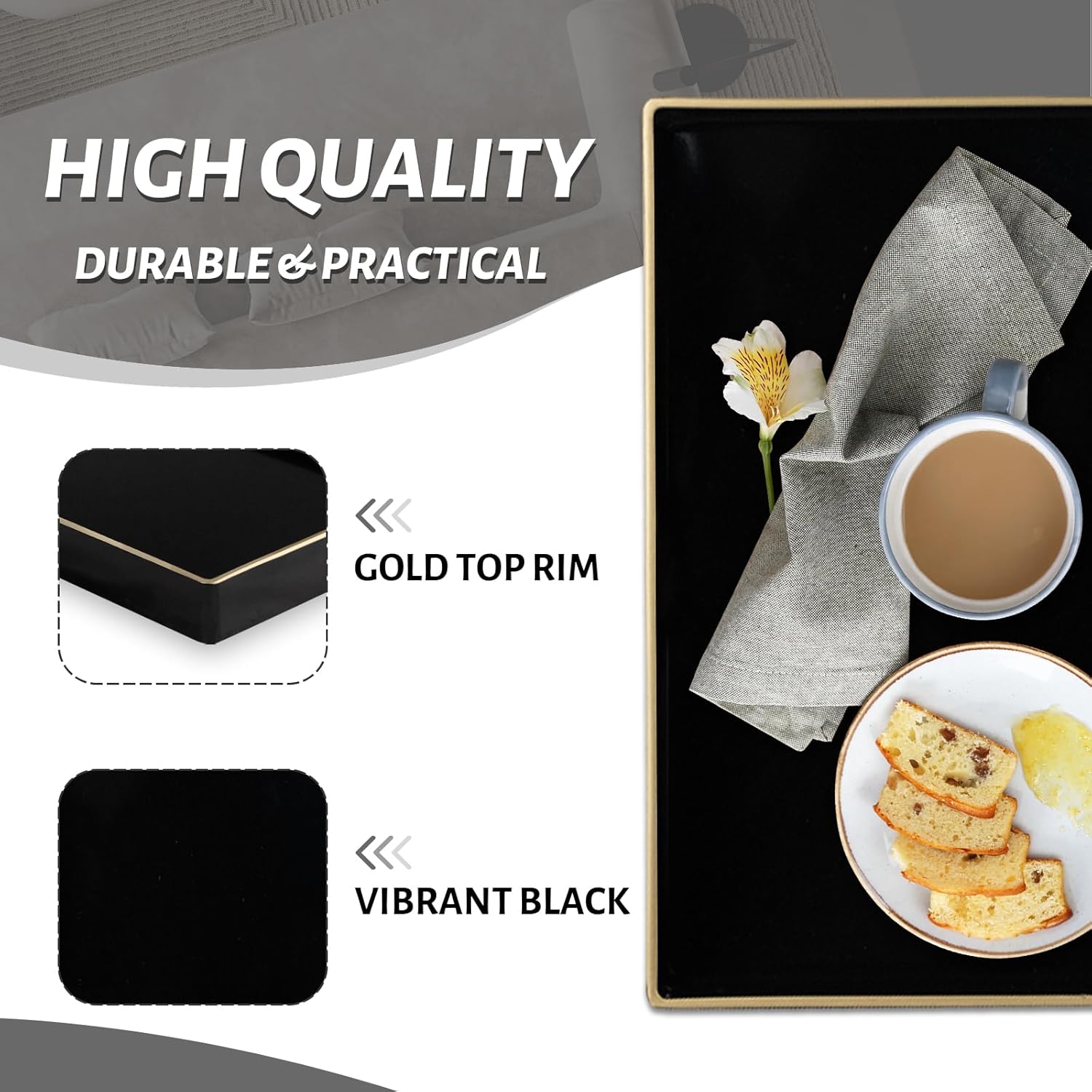 ELEGANT DESIGN: With a simple solid color finish and golden top rims, the serving tray decorative has a modern and elegant look to create an eye-catching display effect for your items. This chic black decorative tray can add a touch of color to your room and become a great addition to your home.