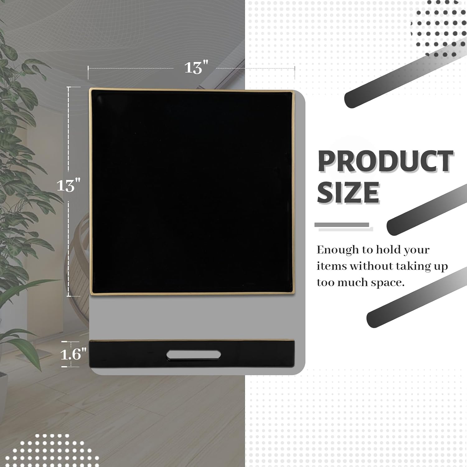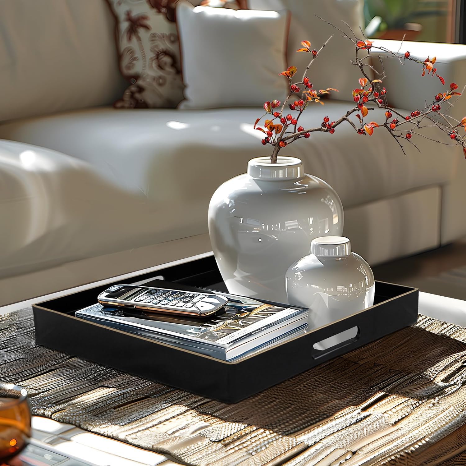 ELEGANT DESIGN: With a simple solid color finish and golden top rims, the serving tray decorative has a modern and elegant look to create an eye-catching display effect for your items. This chic black decorative tray can add a touch of color to your room and become a great addition to your home.