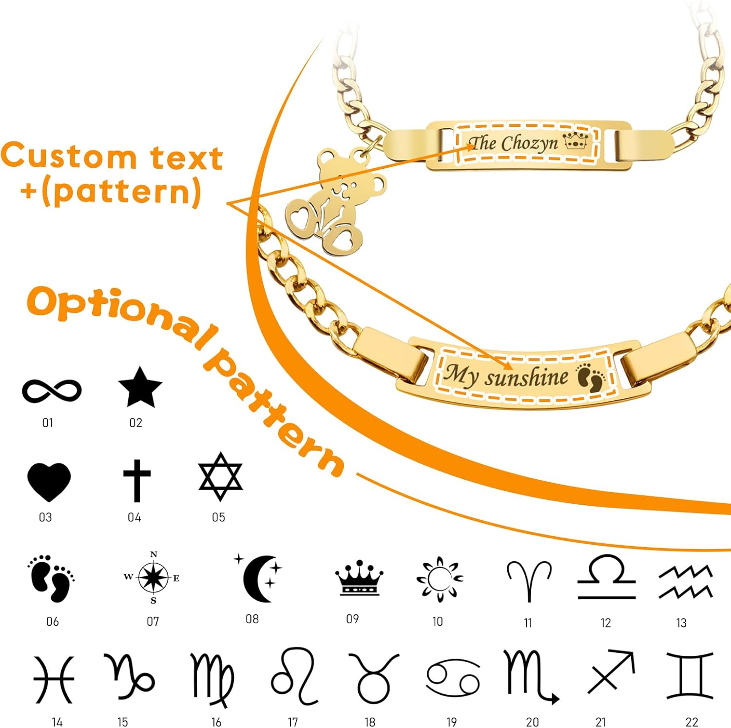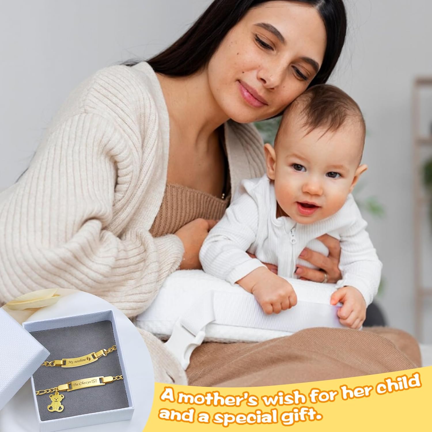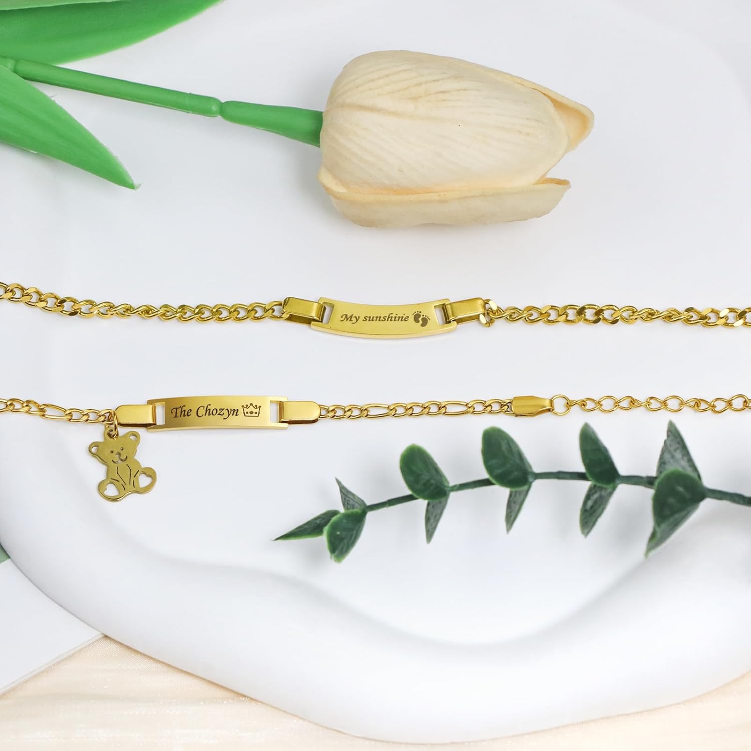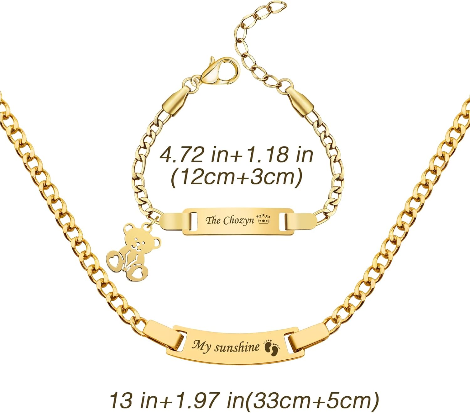 Celebrate life’s precious moments with this exquisite personalized baby jewelry set. The matching bracelet and necklace feature a sleek name bar design crafted from durable stainless steel with an elegant gold-plated finish. Perfect for baptisms, birthdays, or as a thoughtful gift for new moms, this customizable set adds a touch of sophistication to any special occasion. The ID bracelet and necklace can be personalized with your child’s name, making it a unique and cherished keepsake. The stainless steel construction ensures lasting quality while being gentle on sensitive skin. This delightful jewelry set makes a meaningful present that both parents and children will treasure for years to come. The timeless design grows with your child, serving as a beautiful reminder of childhood milestones and celebrations. Recommended wearing age: 36 months and above