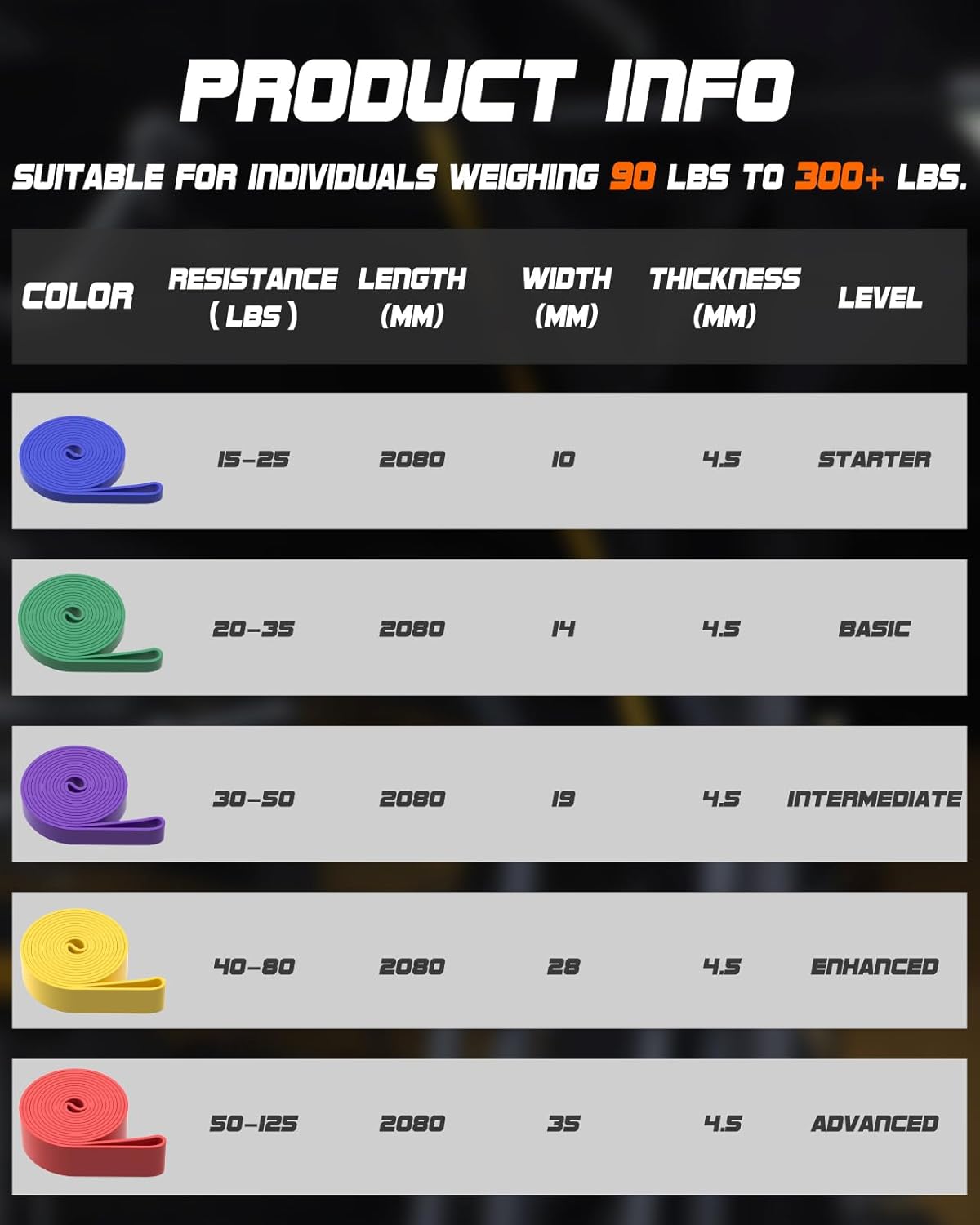 5 Resistance Levels: Our Pull Up Resistance Band Set includes 5 bands color-coded for different resistance levels: Blue (15-25 lbs), Green (20-35 lbs), Purple (30-50 lbs), Yellow (40-80 lbs), and Red (50-125 lbs).