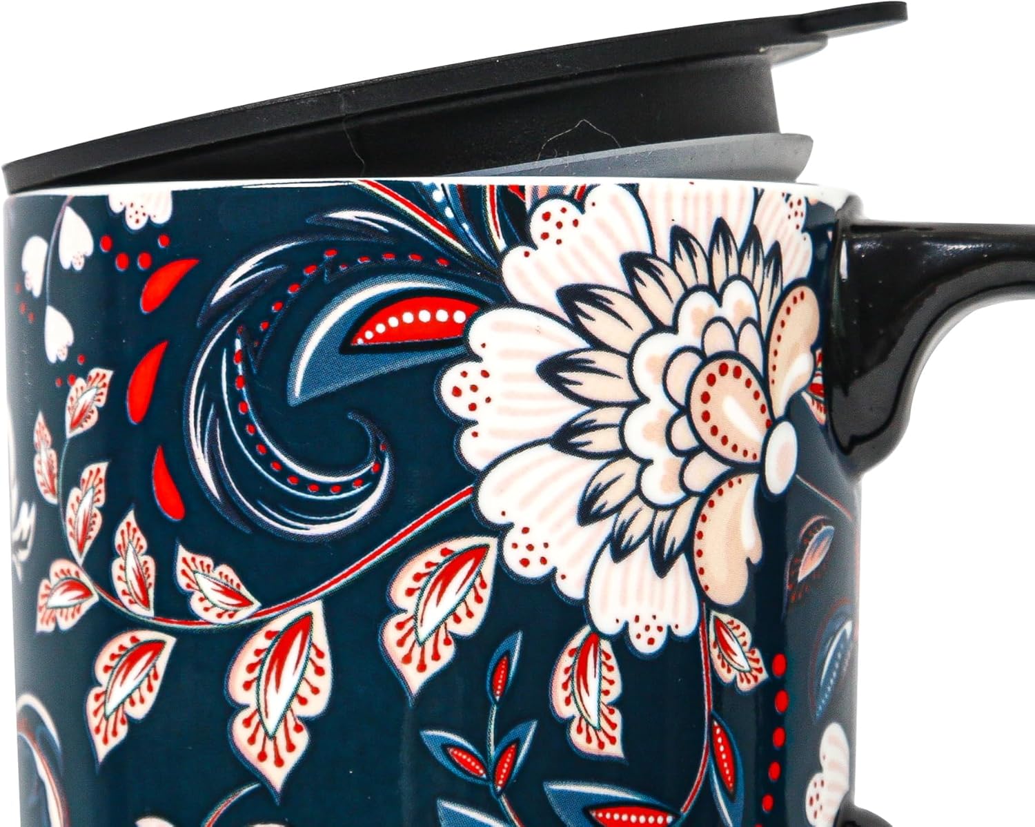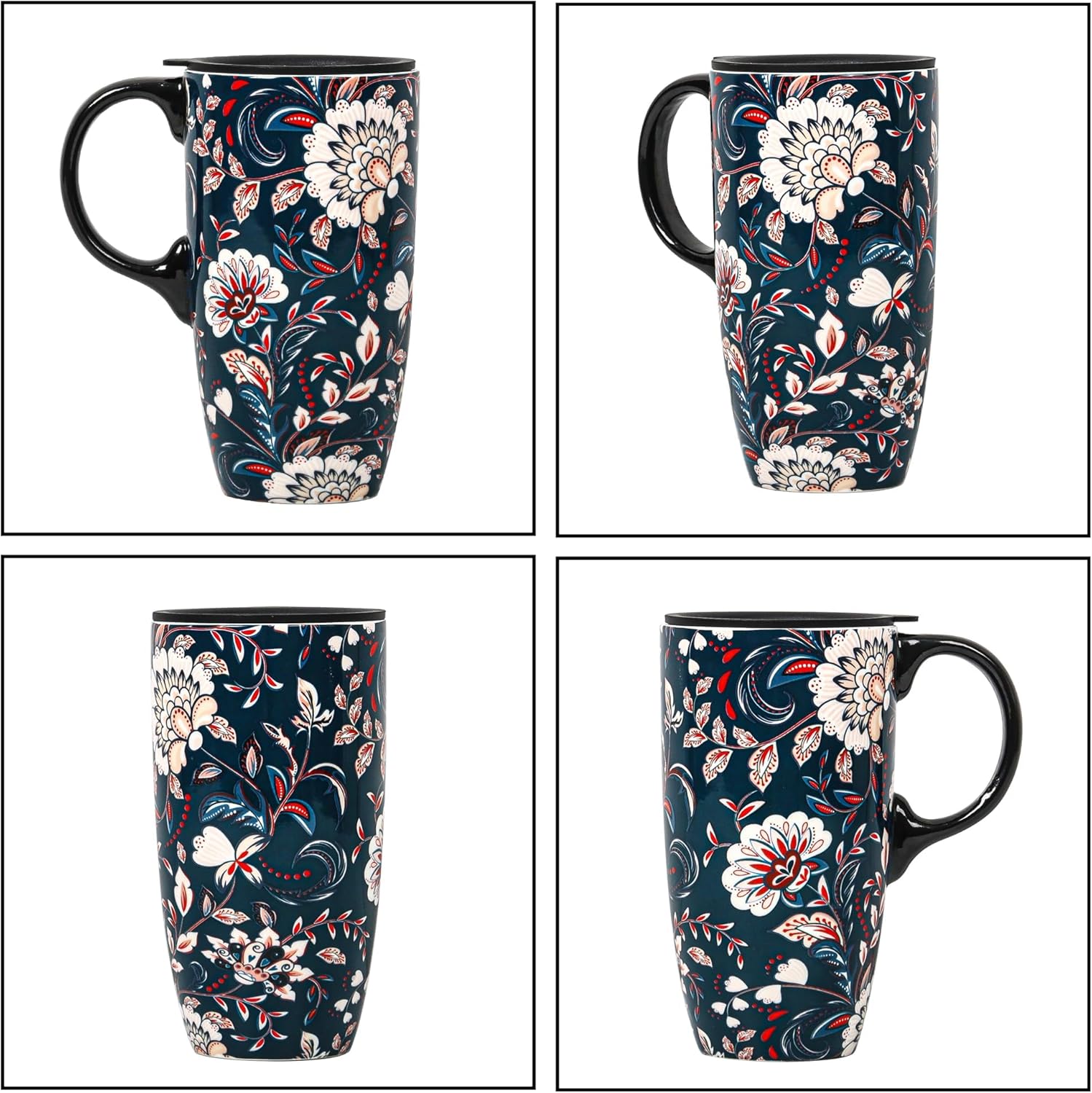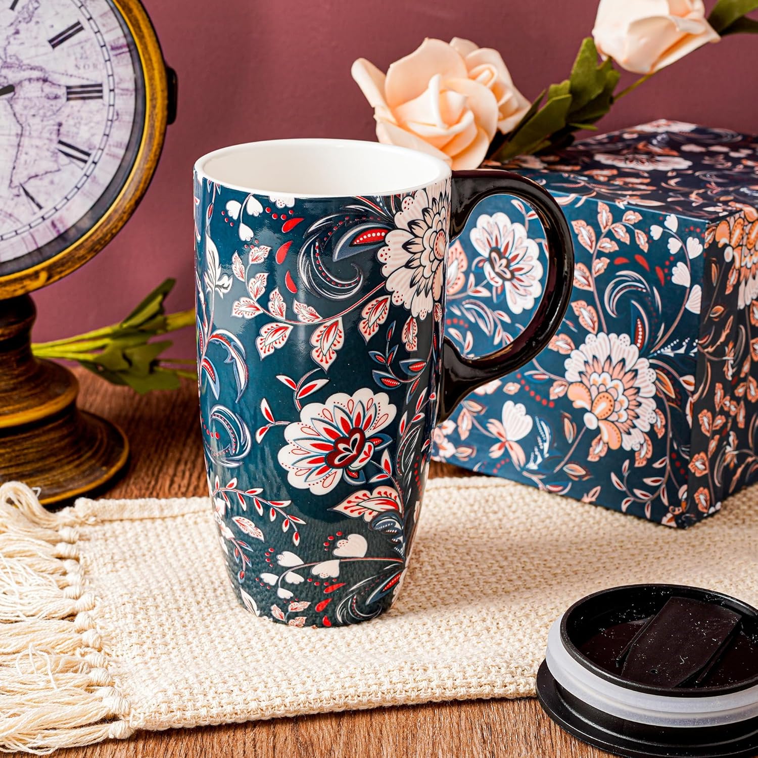 Topadorn Ceramic Coffee Mug Porcelain Latte Tea Cup With Lid and Present Box 17oz,Blue Flower
