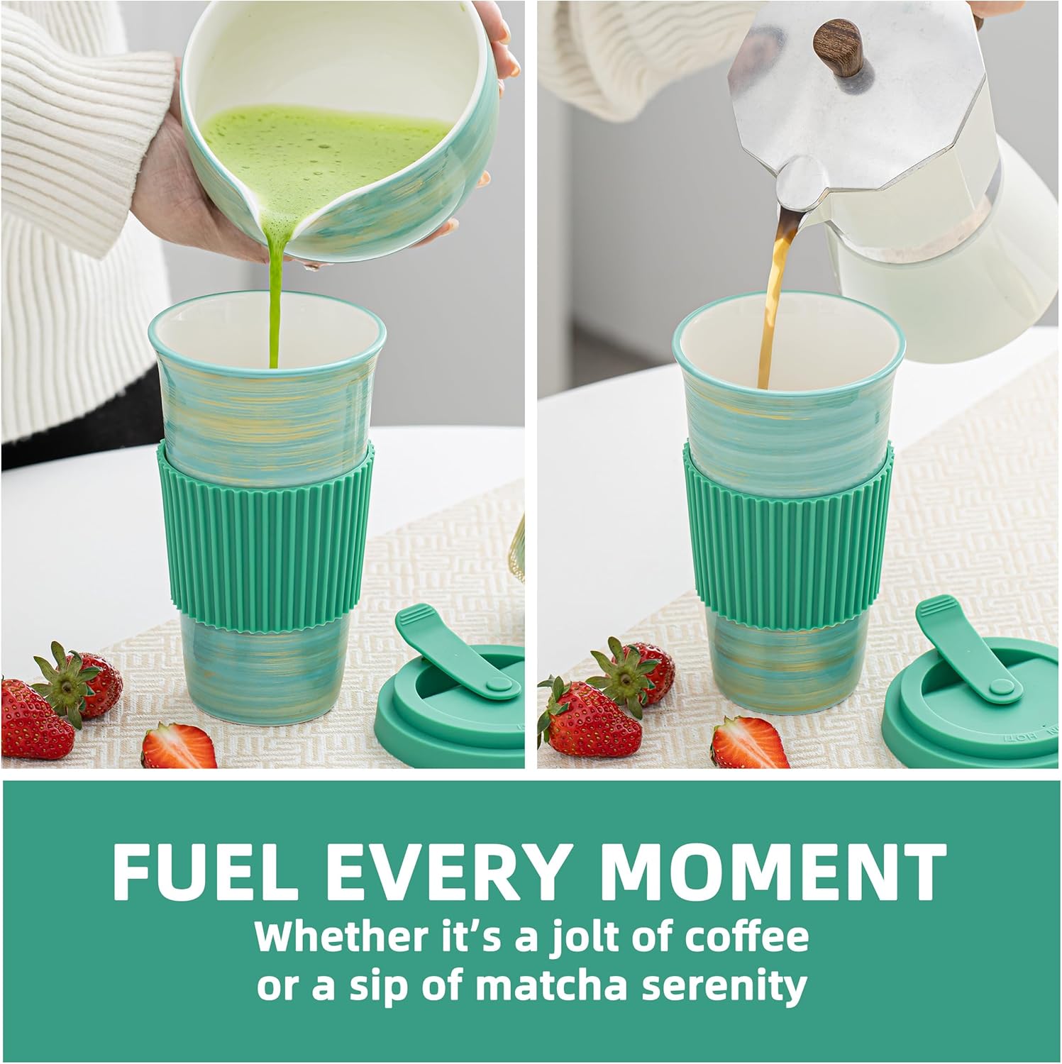 PORTABLE PERFECTION: Our ceramic mugs fit most car cup holders. The leak proof silicone lid ensures worry free travel. A stainless steel straw enables easy sipping, and a heat resistant silicone sleeve offers comfort and protects against burns