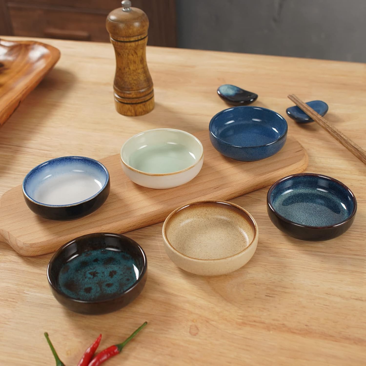 JAPANESE STYLE DESIGN:Each soy sauce bowls has a unique color design, this unique color can only be achieved by reactive glaze, Japanese style sushi soy sauce dish will make your sushi feast look more appetizing