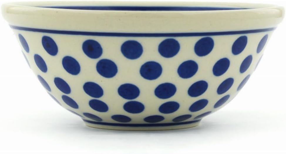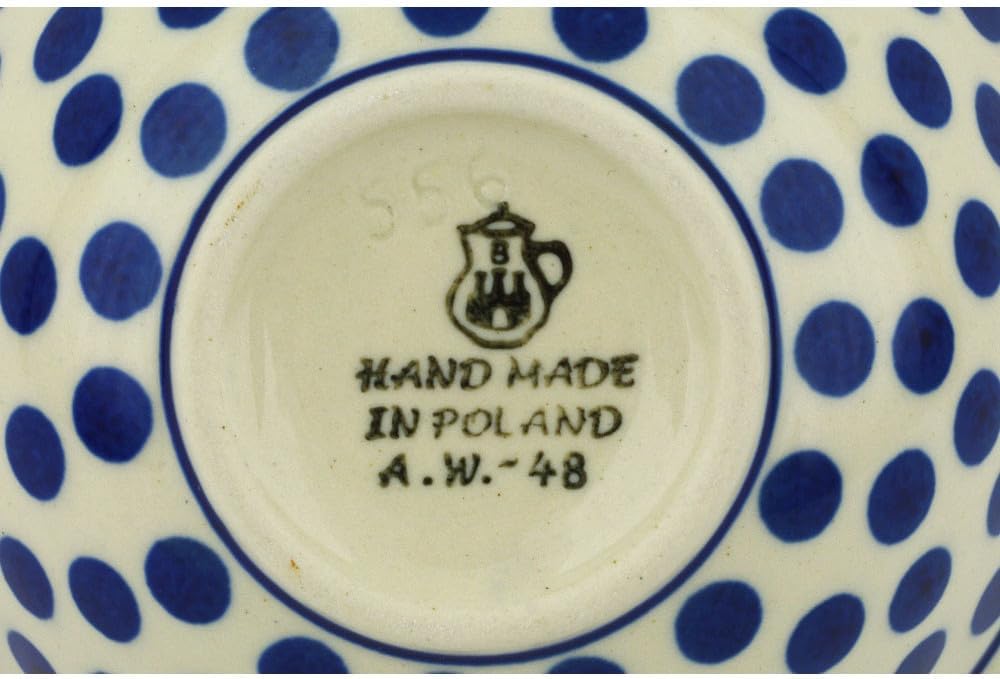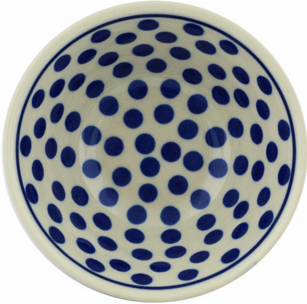 Authentic Polish Pottery Bowl in Polka Dot Delight Design Handmade in Bolesławiec, Poland by Ceramika ArtystycznaCertificate of Authenticity and origin is includedDimensions: 1.97″ high, 4.76″ wide, 4.76″ long, (max. outside edge or handle)Capacity: 8oz (filled to the rim)Polmedia Polish Pottery Features:* Durability: Polish pottery is known for its high durability, able to withstand the rigors of daily use including being microwave, dishwasher, and oven safe.* Handcrafted Artistry: Each piece is hand-painted and hand-stamped, making every item a unique work of art.* Distinctive Patterns: The pottery features a wide range of patterns, from traditional Polish motifs to modern designs, each with its own story and inspiration.* Versatility: Beyond its beauty, Polish pottery is highly functional, suitable for use across cooking, baking, serving, and decoration.* Made in Poland: Authentically Crafted in the Heart of Poland: Exclusively Handmade in Bolesławiec, Far from Mass Production* Sustainable and Ethical Craftsmanship: Polish pottery is made with a commitment to sustainability and ethical practices. Each piece from Bolesławiec is a testament to the artist’s touch over industrial exploitation.The Essence of Polish Pottery:For centuries, the tradition and originality of Bolesławiec craftsmanship have shone through each piece of Polish pottery. Known for its blend of functionality and beauty, it resists scratches and chips, distributes heat evenly, and features vibrant, never-fade patterns for endless mix-and-match potential. Each lead and cadmium-free piece is crafted for durability and safety, adding style to your kitchen. Meticulously decorated by hand, especially the unique UNIKAT patterns, it bears the artist’s signature, celebrating the heritage of Polish artistry.